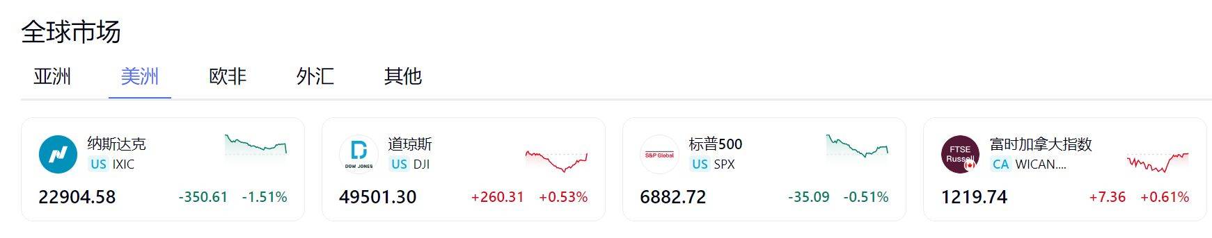 昨夜今晨,美股市场延续风格轮动的态势,在多家科技权重持续回调的压力下,纳指连续第二天跌超1%。标普500指数同样收跌,但其中超7成成分股以涨 势收盘。 截至收盘,标准普尔500指数跌0.51%,报6882.72点;纳斯达克综合指数跌1.51%,报22904.58点;道琼斯工业平均指数涨0.53%,报49501.3点。连续两日下 跌后,纳指也跌破了100日均线。 财报方面,谷歌母公司ALPHABET第四财季营收1,138.3亿美元,同比增长18%,预估1,114亿美元,谷歌云收入176.6亿美元,同比增长48%;经营利润359.3 亿美元,同比增长16%,预估369.5亿美元。公司四季度大模型Gemini月活用户数(MAU)超过7.5亿。公司预计2026年资本开支1750亿~1850亿美元,分析 师预期1195亿美元。 周三市场的关键异动,是光伏板块在"SpaceX团队考察中国光伏产业链"的消息影响下全面上涨。其中微型逆变器制造商Enphase Energy涨38.60%、 SolarEdge涨13.14%,光伏组件龙头晶科能源涨8.66%。 按照市值排名,截至收盘,英伟达跌3.41%、苹果逆势上涨2.6%、谷 ...