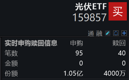 值得一提的是,光伏ETF(159857)盘中申购已超1亿份。 | | 光伏ETF द्रे 159857 | | --- | --- | | | FO V 品 照 | | 实时申购赎回信息 | 申购 岐口 | | 筆数 | વેર 40 | | 金额 | O O | | 份额 | 1.05亿 4000万 | 截至2月26日,光伏ETF(159857)近1月规模增长1.18亿元,近1月份额增长1.53亿份,实现显著增长。 资金流入方面,光伏ETF(159857)近13个交易日合计"吸金"3832.41万元。 【产品亮点】 光伏ETF(159857)有望成为投资者把握全球新能源革命、布局光伏产业核心资产的高效工具,在行业周期修复与技术突破中持续受益。 截至2026年2月27日 13:22,光伏ETF(159857)盘中换手10.52%,成交2.58亿元,市场交投活跃。跟踪的中证光伏产业指数(931151)强势上涨1.11%,成分 股聚和材料上涨12.20%,南网能源上涨10.04%,钧达股份上涨10.00%,金开新能,拉普拉斯等个股跟涨。 2月27日,光伏设备概念股走高,太空光伏方向逆势活跃。A股钧达股份涨停,H ...