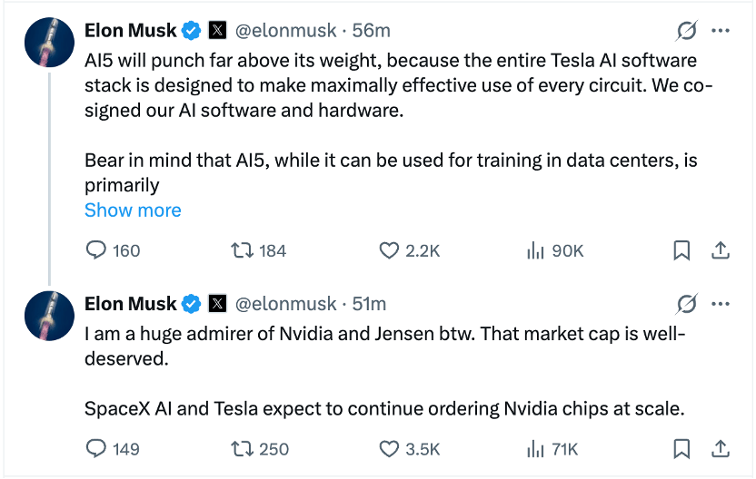 然而,更受市场关注的是他随后补充的一条直接表态。 在这条动态中,马斯克写道:"SpaceX AI和特斯拉预计将继续大规模订购英伟达芯片。" 与此同时,他还明确表示自己是英伟达及其CEO黄仁勋的"忠实仰慕者",并称该公司的市值"实至名归"。 特斯拉CEO埃隆·马斯克确认旗下公司仍将长期、大规模依赖英伟达的算力芯片。 当地时间3月18日晚间,马斯克在X上评价特斯拉下一代AI芯片AI5时表示,该芯片之所以能够"发挥远超体量的能 力",关键在于特斯拉从底层实现了AI软件与硬件的协同设计,从而最大化每一块电路的利用效率。他同时强调,AI5 虽然可以用于数据中心训练,但其核心定位仍然服务于特定场景的高效推理与应用。 有意思的是,就在公开肯定英伟达之前不久,马斯克在英伟达GTC大会期间的一句评论,也引发行业广泛关注。 在回应有关"AI行业几乎所有人都在参加GTC"的讨论时,马斯克在X上写道:"当其他人忙于参加行业会议时,我们则 专注于打磨核心能力。" 不过,业内认为,这一表态并不构成对英伟达技术路线的否定,相反,它与其"继续大规模采购英伟达芯片"的言论几 乎同时出现,更凸显出一种典型的"竞合关系"。 从行业角度看,GTC已 ...