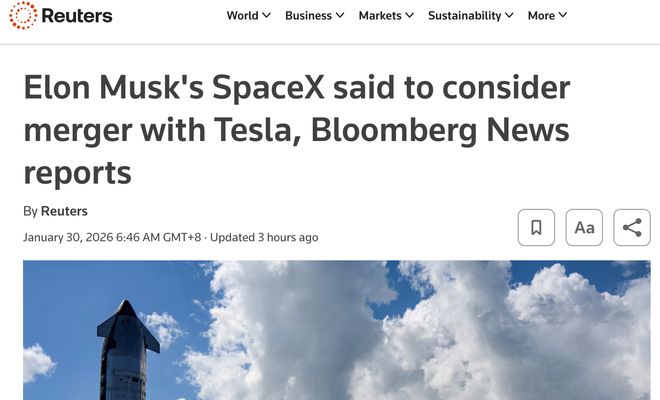 来源:环球网 据内部人士称,SpaceX正评估多种资本运作方案,包括直接收购特斯拉股份或推动三方换股合并。 其中一种激进设想为:以SpaceX为核心,将特斯拉的能源与自动驾驶技术、xAI的Grok聊天机器人及研 发能力,与SpaceX的星链(Starlink)卫星互联网、火箭发射业务深度整合,形成覆盖"天地人"的闭环 生态。(青山) 【环球网科技综合报道】1月30日消息,据路透社报道 知情人士透露,埃隆·马斯克(Elon Musk)旗下 太空探索公司SpaceX正探讨与电动汽车制造商特斯拉进行潜在合并,同时考虑与人工智能初创公司xAI 深化战略合作。这一系列动作若落地,将整合火箭发射、星链卫星网络、电动汽车、社交媒体平台及生 成式AI技术,构建全球科技领域的"超级生态体"。 ...