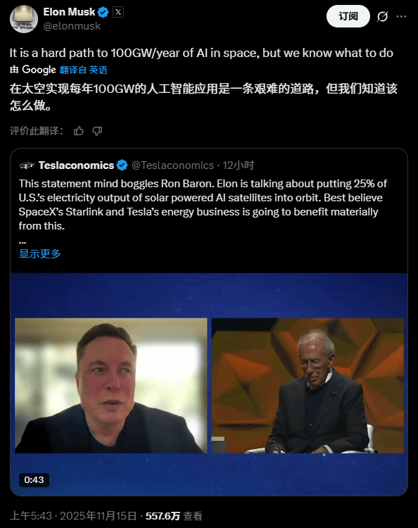 马斯克最新访谈:目标每年在太空部属100吉瓦AI卫星
