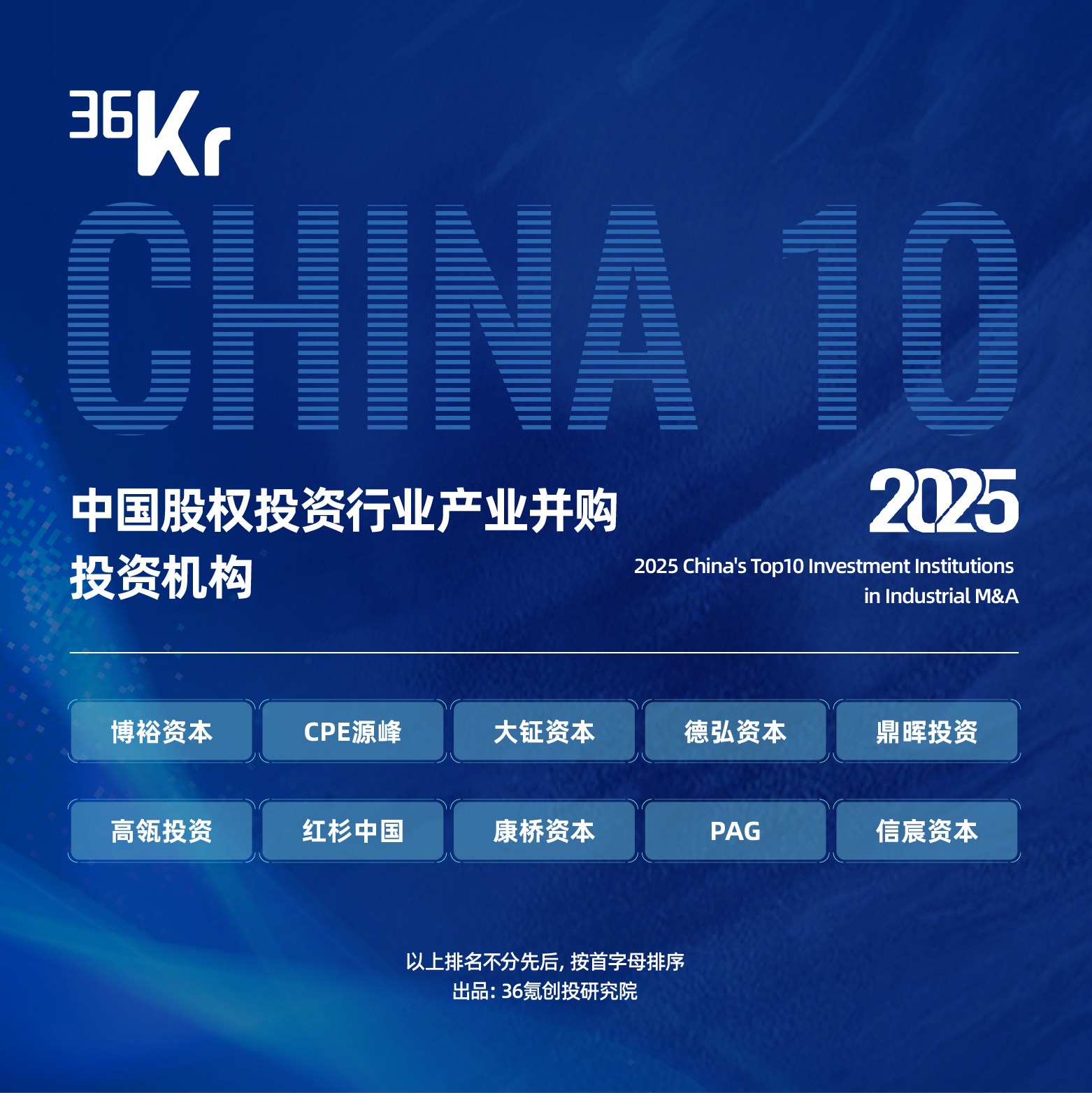 只要肯登攀。 出品 | 36氪创投研究院 站在2025年的岁末,当我们试图为这一年的资本市场寻找一个确切的注脚时, "并购" 无疑是最为响亮的一个词。 在"并购六条"等政策的持续推动下,上市企业、地方国资、险资、VC/PE机构都参与进入并购市场,独立或联合其他国资、产业资本、金融机构等加速并购 基金的设立与运作。如果说前几年的市场是在迷雾中摸索,那么2025年的中国并购市场,则是在阳光下确立了新的秩序。这一年,我们惊喜地发现,资本不 再仅仅追逐账面上的高倍数回报,而是回归到了商业的本质—— 对优质资产的深度掌控与价值重塑 。总体来看,随着宏观经济韧性的持续显现和政策环境 的精准疏导, 2025年成为了中国并购市场从"策略性尝试"走向"系统性繁荣"的关键分水岭 。 361 中国股权投资行业产业并购 投资机构 2025 China's Top10 Investment Institutions in Industrial M&A 博裕资本 鼎晖投资 CPE源峰 大征资本 德弘资本 红杉中国 信宸资本 高瓴投资 PAG 康桥资本 以上排名不分先后,按首字母排序 出品: 36氪创投研究院 36K 中国股权投资行业 产 ...