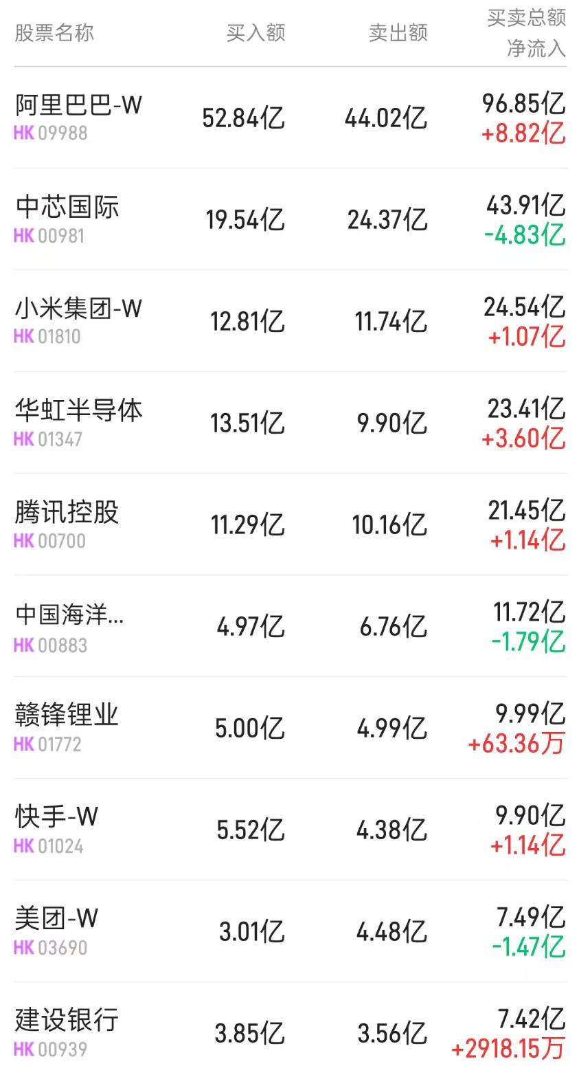| 股票名称 | 买入额 | 卖出额 | 买卖总额 | | --- | --- | --- | --- | | | | | 净流入 | | 阿里巴巴-W HK 09988 | 52.84 Z | 44.02 Z | 96.85亿 | | | | | +8.82 乙 | | 中芯国际 HK 00981 | 19.54 Z | 24.37 Z | 43.91亿 -4.83 Z | | 小米集团-W | 12.81亿 | 11.74 Z | 24.54亿 | | HK 01810 | | | +1.07 亿 | | 华虹未营体 | 13.51 乙 | 9.90 Z | 23.41 亿 | | HK 01347 | | | +3.60 Z | | 腾讯控股 | 11.29亿 | 10.16亿 | 21.45亿 | | HK 00700 | | | +1.14 乙 | | :洪映圖中 | 4.97亿 | 6.76亿 | 11.72亿 | | HK 00883 | | | -1.79 乙 | | 赣锋锂业 | 5.00亿 | 4.99亿 | 9.99亿 | | HK 01772 | | | +63.36万 | | 港股通 ...