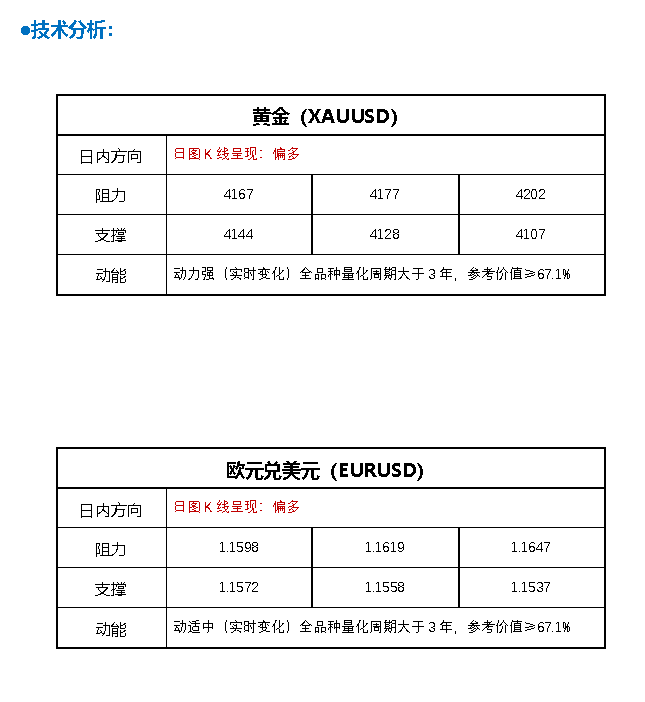 ●FPG最新市场脱水消息: 1. 美国与乌克兰官员周二表示,乌克兰已原则上同意美国提出的和平协议,但仍有部分条款需讨论。消 息传出后,现货黄金大幅下滑,最低一度跌至4109.47美元/盎司。 2. 当地时间周二,美国总统特朗普表示,乌克兰与俄罗斯的和平协议已"非常接近达成"。 3. 周一,美联储理事沃勒表示,就业市场疲弱到足以支持12月再降息25个基点。此外,旧金山联储主席 戴利也表态支持在下月会议降息。 ●FPG fortune prime global分析师观点: FPG特约分析师(Felix)观点: | | 黄金 (XAUUSD) | | | | --- | --- | --- | --- | | 日图 K 线呈现: 偏多 日内方向 | | | | | 4167 阻力 | | 4177 | 4202 | | 支撑 4144 | | 4128 | 4107 | | 动能 | 动力强(实时变化)全品种量化周期大于3年,参考价值≥67.1% | | | | | 欧元兑美元 (EURUSD) | | | | --- | --- | --- | --- | | 日图 K 线呈现: 偏多 日内方向 | | | | ...