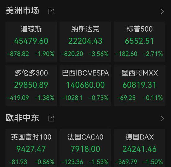 万得美国科技七巨头指数跌超3%,特斯拉跌超5%,亚马逊、英伟达跌超4%。美股芯片股表现疲软, ARM跌超9%,安森美半导体、微芯科技跌超8%,超威半导体、高通跌超7%。 大宗商品方面,国际金价拉升,伦敦现货黄金、COMEX黄金期货均涨超1%;原油、有色金属价格齐跳 水,其中美国WTI原油期货跌超5%,LME期铜跌超4%。 纳斯达克指数跌3.56% 当地时间10月10日,美股三大指数均小幅高开,盘中全线跳水并转跌。Wind数据显示,截至收盘,道 琼斯工业指数跌1.9%,跌878.82点;纳斯达克指数跌3.56%,跌820.20点;标普500指数跌2.71%,跌 182.60点。 大型科技股全线下跌,万得美国科技七巨头指数下跌3.65%。个股方面,特斯拉跌超5%,亚马逊、英伟 达跌超4%,META、苹果跌超3%,微软跌超2%,谷歌-C跌超1%。 来源:中国证券报 当地时间10月10日,欧美股市集体下跌,其中纳斯达克指数大跌820.20点,跌幅为3.56%。 贵金属方面,截至收盘,伦敦现货黄金价格涨超1%,报4017.845美元/盎司;COMEX黄金期货涨超 1%,报4035.5美元/盎司;伦敦现货白银价格涨近2% ...