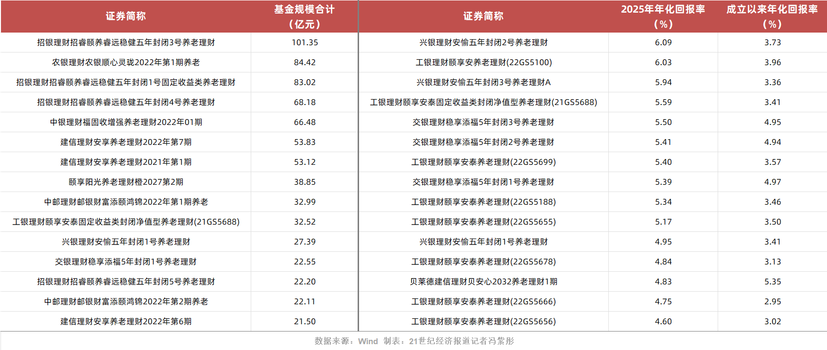 21世纪经济报道记者林汉垚 见习记者冯紫彤 2021年底,养老理财在"四地四机构"的框架下谨慎启航。如今,随着试点范围稳步扩大至全国,它亦逐步成长为养老第三支柱中一股稳健而不可或缺的力 量。 在收益分化的另一面,是产品规模呈现出的集中态势。截至2025年末,全市场51只产品总规模为1063亿元;其中,规模超过50亿元的产品共有7只,合计规 模约510亿元,占据了总规模的近半壁江山。 Wind数据显示,截至2025年末,养老理财产品规模已突破千亿,达1063亿元,共有10家理财子公司发行了51只产品。从收益表现看,2025年养老理财产品 平均年化收益率达3.94%,其中10只产品年化收益率超过5%,整体表现优于普通理财产品。 进入"十五五"时期,养老金融体系建设持续深化,行业发展重心逐渐从规模扩张转向能力提升。如何在长期利率下行的环境中保持收益韧性、如何打破产品 同质化困局,成为行业面临的核心挑战,也对机构的产品创新、长期投资与风险管理能力提出了更高要求。 值得关注的是,2026年底,首批成立于2021年的试点产品将结束五年封闭期。这批"元老"产品的兑付表现与资金流向,将成为观测行业生命力的首个关键窗 口。 1 ...