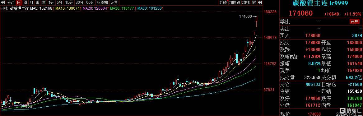 一场由政策催化的抢出口潮,让碳酸锂市场在传统淡季上演了"疯狂行情"。 1月13日,广期所碳酸锂期货主力合约触及涨停,涨幅11.99%,报174060元/吨,连续两个交易涨停,本月迄今累计涨超 40%。从2025年6月的近6万元低点算起,这场"史诗级"反弹已让锂价飙涨超190%。 | ● 分时 日 周 月 季 年 1分 5分 30分 60分 多周期 设置 | 九转 加自选 均线 面 一 | | | 碳酸创主连 lc9999 | | | | --- | --- | --- | --- | --- | --- | --- | | 日线 张酸娟主洁 MA5: 152168; MA10: 139074; MA20: 126604; MA30: 116177; MA60: 101250; | | | | | | | | | 174060 | 80226 | | 174060 | +18640 | +11.99% | | | | | | | | 开户 | | | | | 英H | | | | | | | | 买) | 174060 | | 3874 | | | | | 成公 | 174860 开盘 | | 168000 | ...
