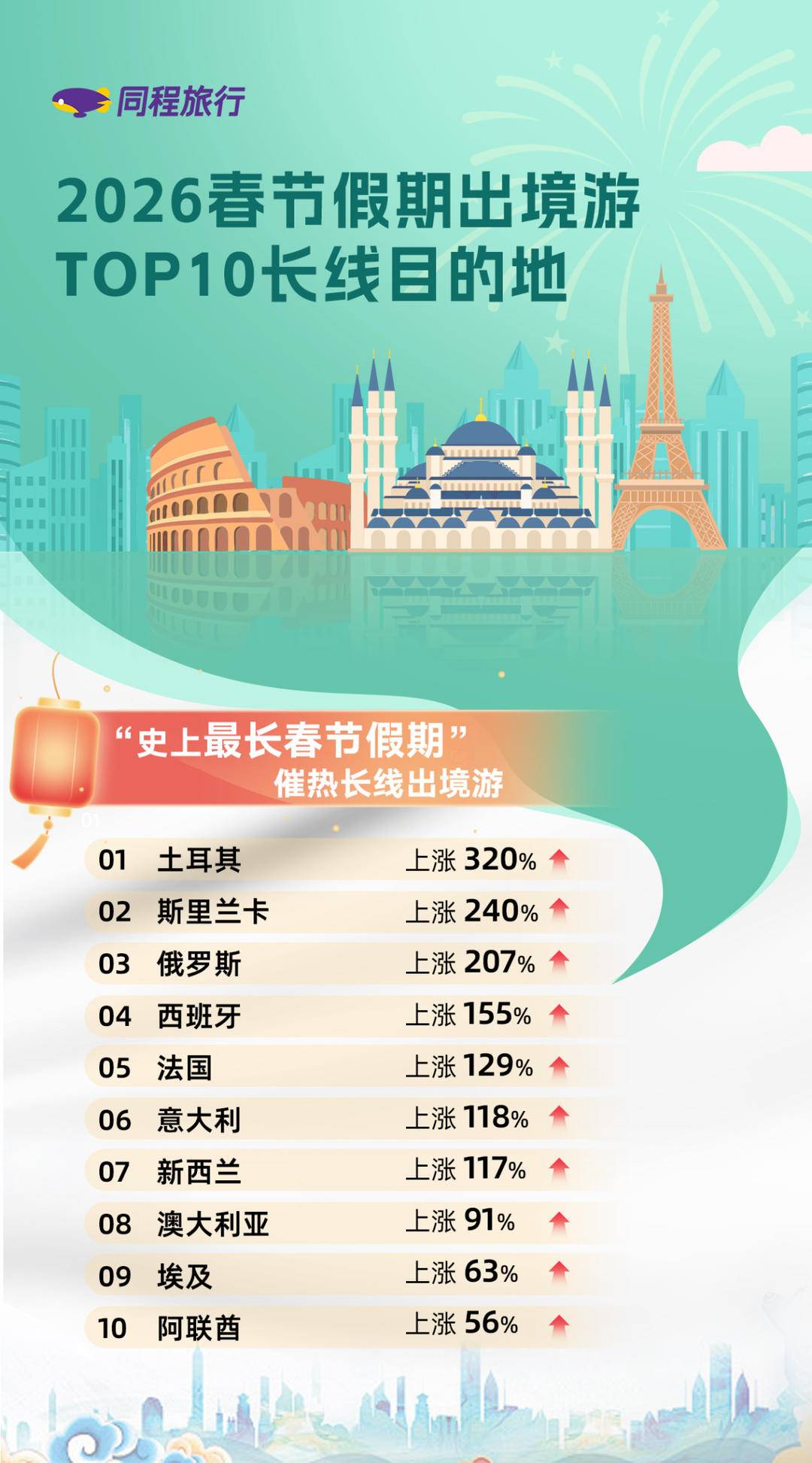 | 01 土耳其 | 上涨 320% ↑ | | --- | --- | | 02 斯里兰卡 | 上涨 240% ↑ | | 03 俄罗斯 | 上涨 207% ↑ | | 04 西班牙 | 上涨 155% ▲ | | 05 法国 | 上涨 129% ↑ | | DC *** | + 70LL 4 | 2026年春节9天连休,促成"史上最长春节假期",直接刺激出境游需求的爆发。同程旅行数据显示,截至1月12日,春节出境游相关产品预订已进入高峰时 段。春节前后出发的个人旅游签证、机票、酒店、跟团游等产品搜索量及预订热度全面超越2025年春节。5天-7天的短途出境游产品预订仍占据主流,不 少人将出发节点延至大年初二前后,回乡过年、出国度假"两不误"的趋势越发明显。 随着大众旅行消费升级,今年春节假期,非一线城市尤其是中西部城市用户出境游热情高涨。同程旅行数据显示,春节出境游TOP15客源地中,成都、重 庆、武汉、乌鲁木齐、太原、长沙等中西部城市纷纷上榜,占比达到四成左右。东部沿海城市依然是出境游主力,其中,杭州表现比较突出,其出境游热 度超越广州,成为仅次于上海、北京、深圳的第四大出境游客源地。 "新晋免签国"增长 ...