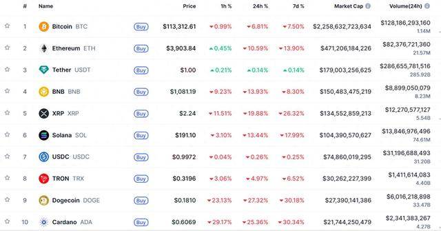 10月11日,全球加密货币市场出现剧烈抛售,主流数字资产比特币在短短数小时内跌幅逼近13%,一度跌破11万美元大关,最低触及约10.6万美元。此次跌 势是自2024年4月以来最大单日回撤,直接触发了前所未有的强制平仓潮。 | | # | Name | | Price | 1h % | 24h % | 7d % | | --- | --- | --- | --- | --- | --- | --- | --- | | ಕ್ಕೆ | 1 13 | Bitcoin BTC | Buy | $113,312.61 | -0.99% | - 6.81% | ▼ 7.50% | | 53 | 2 | Ethereum ETH | Buy | $3,903.84 | - 0.45% | ▼ 10.59% | ▼13.90% | | ಕೆ | 3 | Tether USDT | Buy | $1.00 | - 0.21% | - 0.14% | - 0.14% | | ಭ | 4 5 | BNB BNB | Buy | $1,081.19 | - 9.23% | ▼13.93% | ▼8.30% | | 53 | 5 | X ...