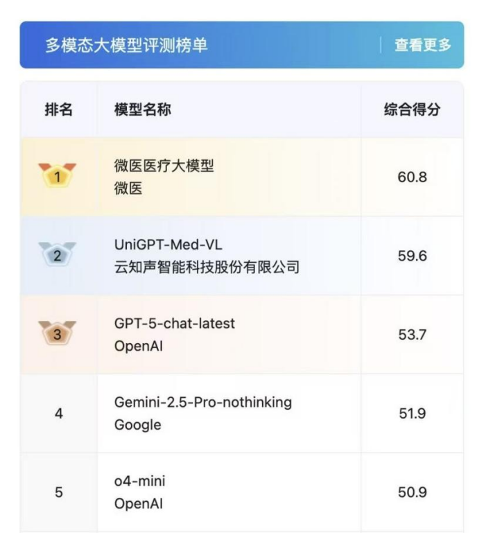 日前,中文医疗大模型权威评测平台MedBench公布了最新一期评测结果,引发关注。由上海人工智能 实验室全新发布的MedBench 4.0,是国内首个且唯一面向医疗垂直大模型、专用大模型及应用场景的综 合性评测与验证的平台,已成为衡量医学人工智能产品性能与可靠性的科学标尺。在迭代至4.0版本的 更为严格、全面的MedBench权威评测中,微医医疗大模型在综合榜单中持续领跑,其突出的临床辅助 能力与可靠性获得验证。 | 多模态大模型评测榜单 | | 查看更多 | | --- | --- | --- | | 排名 | 模型名称 | 综合得分 | | 1 | 微医医疗大模型 微医 | 60.8 | | 2 | UniGPT-Med-VL 云知声智能科技股份有限公司 | 59.6 | | 3 | GPT-5-chat-latest OpenAl | 53.7 | | 4 | Gemini-2.5-Pro-nothinking Google | 51.9 | | 5 | o4-mini OpenAl | 50.9 | 技术扎根真实场景,驱动价值医疗普惠未来 2025年11月,MedBench升级至4.0版本,聚焦"实战 ...