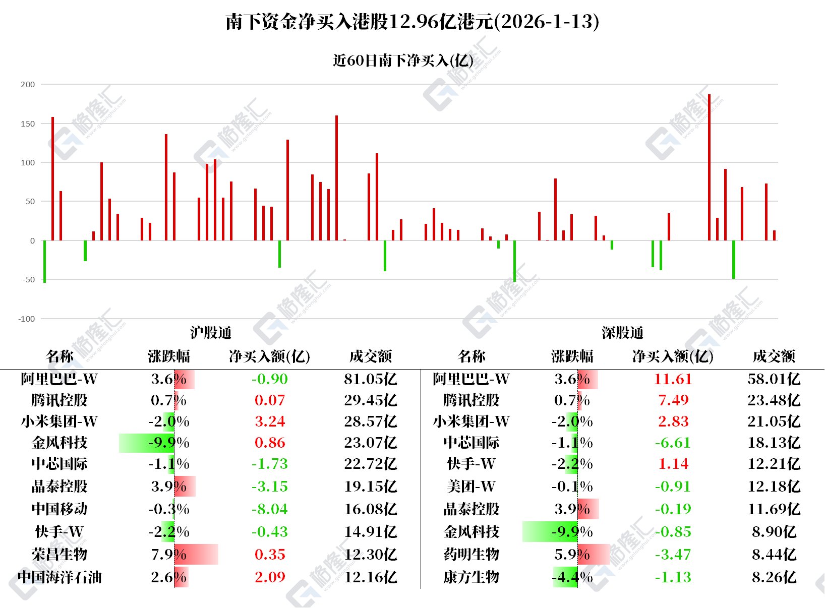 格隆汇1月13日|南下资金今日净买入港股12.96亿港元。其中: 净买入阿里巴巴-W 10.71亿、腾讯控股7.55亿、小米集团-W 6.07亿、中国海洋石油2.08亿; | | 沖股通 | | | | | --- | --- | --- | --- | --- | | 名称 | 涨跌幅 | 净买入额(亿) | 成交额 | 名称 | | 阿里巴巴-W | 3.6% | -0.90 | 81.05 Z | 阿里巴巴-W | | 腾讯控股 | 0.7% | 0.07 | 29.45 Z | 腾讯控股 | | 小米集团-W | -2.0% | 3.24 | 28.57 Z | 小米集团-W | | 金风科技 | -9.9% | 0.86 | 23.07 Z | 中芯国际 | | 中心国际 | -1.1% | -1.73 | 22.72 L | 快手-W | | 品泰控股 | 3.9% | -3.15 | 19.15 Z | 美团-W | | 中国移动 | -0.3% | -8.04 | 16.08 Z | 晶泰控股 | | 快手-W | -2.2% | -0.43 | 14.91亿 | 金风科技 | | 荣昌生物 ...