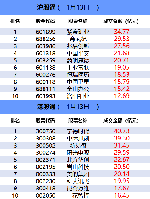 沪深股通今日合计成交4209.36亿,其中紫金矿业和宁德时代分居沪股通和深股通个股成交额首位。板块主力资金方面,医药板块主力资金净流入居首。 ETF成交方面,科创100ETF基金(588220)成交额环比增长211%。 龙虎榜方面,海格通信走出2连板,获两家一线游资(国泰海通证券宜昌沿江大道、国泰海通证券上海江苏路)分别买入3.71亿、2.64亿,同时遭一家一线游 资(华鑫证券上海红宝石路)卖出0.4亿。商业航天概念今日集体退潮,航天电子遭大量资金博弈,一家机构卖出11.1亿,一家量化资金(国泰海通证券总 部)卖出4.29亿,两家一线游资(国泰海通证券宜昌沿江大道、国泰海通证券南京太平南路)合计卖出12.68亿,同时两家机构买入7.59亿,一家量化资金 (国信证券浙江互联网分公司)买入2.73亿。 一、沪深股通前十大成交 今日沪股通总成交金额为1824.91亿,深股通总成交金额为2384.45亿。 | | 沪股道( | 1月13日 | ) | | | --- | --- | --- | --- | --- | | 排名 | 股票代码 | 股票名称 | | 成交金额(亿元) | | 1 | 601899 | 紫 ...