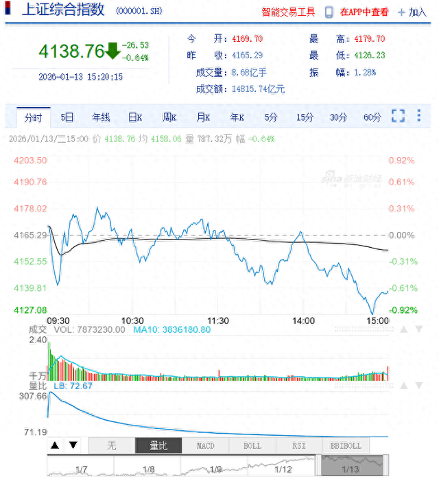 1月13日,A股主要股指回落走低,创业板指跌近2%,科创50指数跌近3%;全A成交近3.7万亿元,再创 历史新高。 中泰证券指出,2026年伴随资金入市与信心增强的趋势不断得到强化,科技板块的预期博弈与价值发现 过程,或将成为资本市场长期关注的方向之一。资金方面,市场长线资金托底,政策推动下市场或维持 交投活跃。长线资金入市、居民资金入市与资本市场政策支持力度上升为市场提供必要流动性条件,下 行风险整体可控。在几大因素共同作用下,市场或难以呈现单边普涨行情,但结构性机会有望持续活 跃,市场整体或呈现以主题驱动为主、资金在不同产业主线间快速轮动的运行特征。市场"主题轮动"格 局或有望得到延续。 (文章来源:证券时报网) 盘面上看,军工、半导体板块跌幅居前,汽车、煤炭、地产等板块均走低,军贸概念、商业航天概念大 幅回调;保险、石油、医药、银行等板块拉升,AI医疗概念、创新药概念等活跃。 截至收盘,沪指跌0.64%报4138.76点,深证成指跌1.37%,创业板指跌1.96%,科创50指数跌2.8%,沪 深北三市合计成交约3.7万亿元。 ...