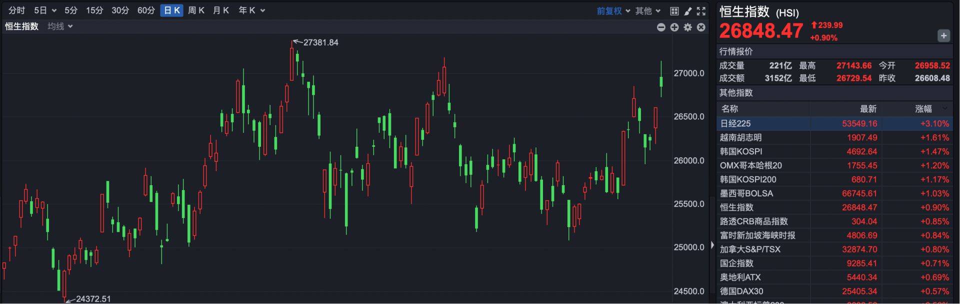 1月13日,港股市场早盘大幅冲高,但下午买盘不济,最终涨幅明显收窄。 花旗集团激进上调贵金属短期展望,在牛市情景下,预计未来3个月内金价将冲至5000美元/盎司,白银达100美元/盎司。这一预测基于地缘政治风险加剧、 实物短缺及美联储政策不确定性。与此同时,摩根士丹利与摩根大通等华尔街投行亦维持长期看涨共识。 截至收盘,恒生指数报收26848.47点,上涨239.99点,涨幅0.90%。港股全天成交3152亿港元,较昨日略有放量。 热点方面,黄金股延续涨势,中国黄金国际(HK02099)涨超7%,灵宝黄金(HK03330)涨近3%,紫金矿业(HK01818)、山东黄金(HK01787)涨超 2%。 恒生科技指数报收5869.79点,上涨6.59点,涨幅0.11%。 创新药概念股涨幅居前,药明康德(HK02359)涨超8%。 1月12日晚,药明康德公布,公司全年预计实现营业收入454.56亿元,同比增长15.84%;其中,持续经营业务收入同比增长约21.40%。预计经调整归母净利 润149.57亿元,同比增长约41.33%;归属于公司股东的净利润191.51亿元,同比增长约102.65%。 此外,荣昌生物涨超7 ...