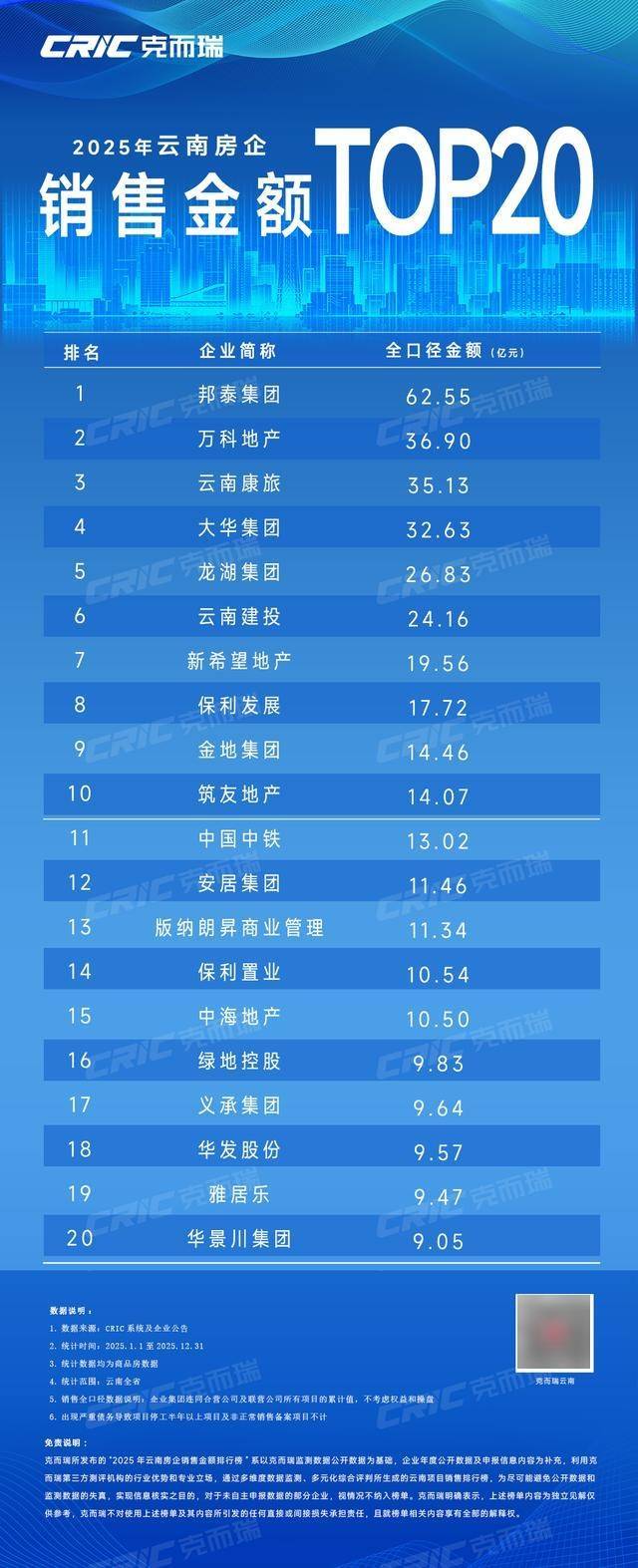 近日,克尔瑞数据发布的《2025年云南房企销售排行榜TOP20榜单》显示,尽管2025年云南房地产市场 整体承压,行业门槛有所下探,但头部房企凭借新盘的高效入市和营销创新,实现了业绩的逆势突破。 与此同时,房企的战略重心持续回调,州市贡献占比逐步收缩,市场分化加剧的趋势愈发明显。 | CRXC 克而瑞 | | | | --- | --- | --- | | | 2025年云南房企 | | | 排名 | 企业简称 | 全口径金额(亿元) | | 1 | 邦泰集团 | 62.55 | | 2 | 万科地产 | 36.90 | | 3 | 云南康旅 | 35.13 | | 4 | 大华集团 | 32.63 | | 5 | 龙湖集团 | 26.83 | | 6 | 云南建投 | 24.16 | | 7 | 新希望地产 | 19.56 | | 8 | 保利发展 | 17.72 | | 9 | 金地集团 | 14.46 | | 10 | 筑友地产 | 14.07 | | 11 | 中国中铁 | 13.02 | | 12 | 安居集团 | 11.46 | | 13 | 版纳朗异商业管理 | 11.34 | | 41.0 | ...