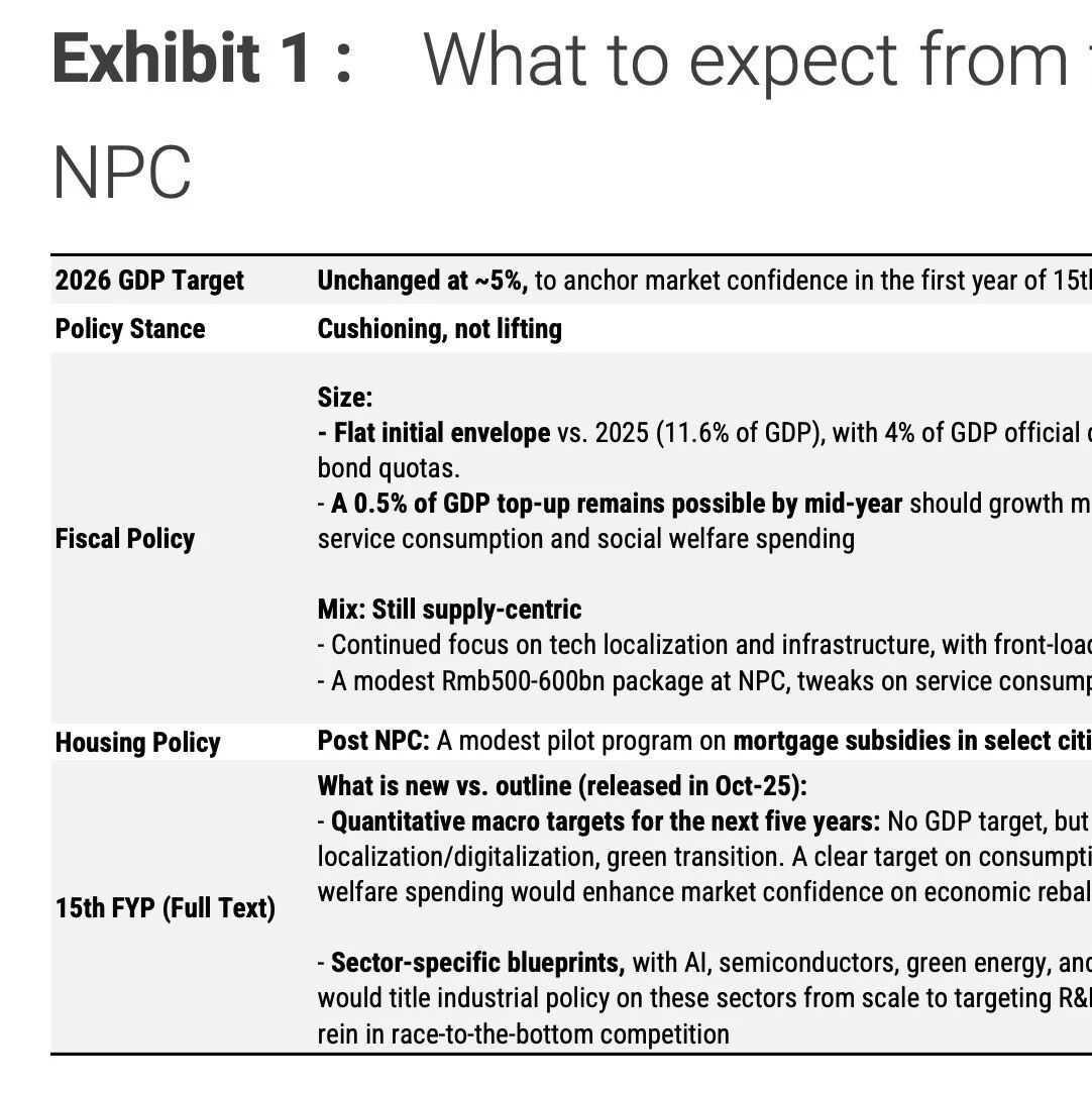1. 全国GDP增长目标大概率维持"5%左右" :尽管三分之二省份下调目标引发市场猜疑,但加权平均后 省级目标仍达5.1%,且"十五五"开局之年稳信心至关重要,因此设定约5%的全国目标仍有支撑。 2. 政策姿态为"托底多于刺激" :即使设定5%目标,也不会"不惜一切代价"强刺激。预计2026年政策力 度与2025年持平——综合预算赤字率4%,政府债券额度大体相似。 3. 政策重心仍在供给侧 :聚焦科技本土化、产业升级和基础设施投资。地方债发行前置以支撑基建。 消费和房地产领域仅设"护栏",而非强刺激——预计消费支持约5000-6000亿元(以旧换新、生育补 贴等),房贷利息补贴或有但有限。 4. 年中或追加温和刺激 :若增长动能走弱,可能追加相当于GDP 0.5%的财政支持(用于服务消费和社 会福利),资金来源为现有债券额度或准财政工具。 5. "十五五"规划聚焦科技 :预计避免设定五年GDP增长目标,转为设定民生、AI/半导体/绿色转型等数 字化目标。产业政策从规模扩张转向研发生态与良性竞争。 6. 2026年展望: 维持实际GDP增长4.8%、名义增长4.1-4.2%的预测。基建与出口对冲地产与消费疲 软 ...