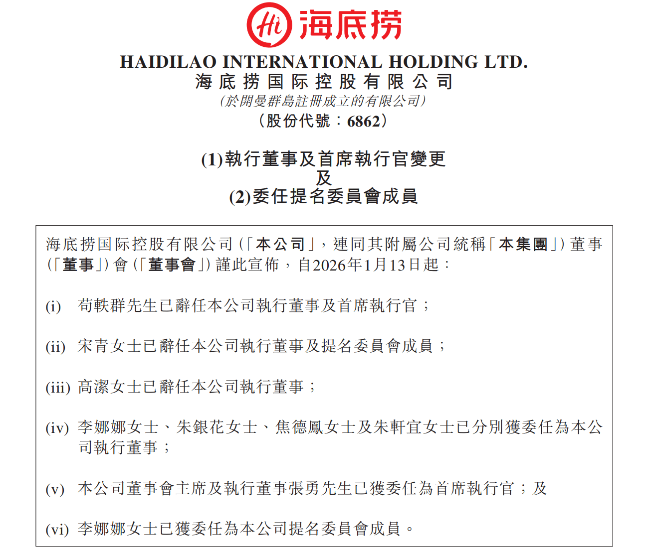 面对麻烦不断的海底捞(06862),公司实控人张勇终于不再淡定。 随着海底捞发布一纸公告,CEO苟轶群连同另外两名执行董事辞职,6名执行董事一半集体离开。公司实控人、董事长张勇时隔约4年重新担任CEO一职,包 括李娜娜在内的4名"女将"一并升任执行董事。 一段时间以来,海底捞接连处于舆论漩涡中。从"纸碗接尿"到"纸尿裤入锅"事件,以及最近告一段落的"小便门"事件,人们不禁要问,以服务溢价见长的海 底捞怎么了,实控人张勇的回归能把海底捞拉回正轨、解决增长焦虑吗? 董事会年轻化,CEO"老龄化" 1月13日晚,海底捞发布公告,1973年出生的苟轶群辞去公司执行董事及首席执行官(CEO)职务。一并辞去执行董事职务的还有宋青和高洁两位女士,两 人分别出生于1981年和1990年。 正如海底捞在公告中所说,考虑到公司的战略方向及未来发展需要,董事会认为委任新董事将会"带来新视野和新动力,提升董事会效率并有助于公司维持 高标准的企业管治"。 在这场人事大调整中,远离一线近4年之久的张勇重回CEO职位。2022年3月张勇把CEO的位置交给了彼时刚过40岁的杨利娟,首位"职业经理人"就没能干满 三年任期。不到两年半后的202 ...