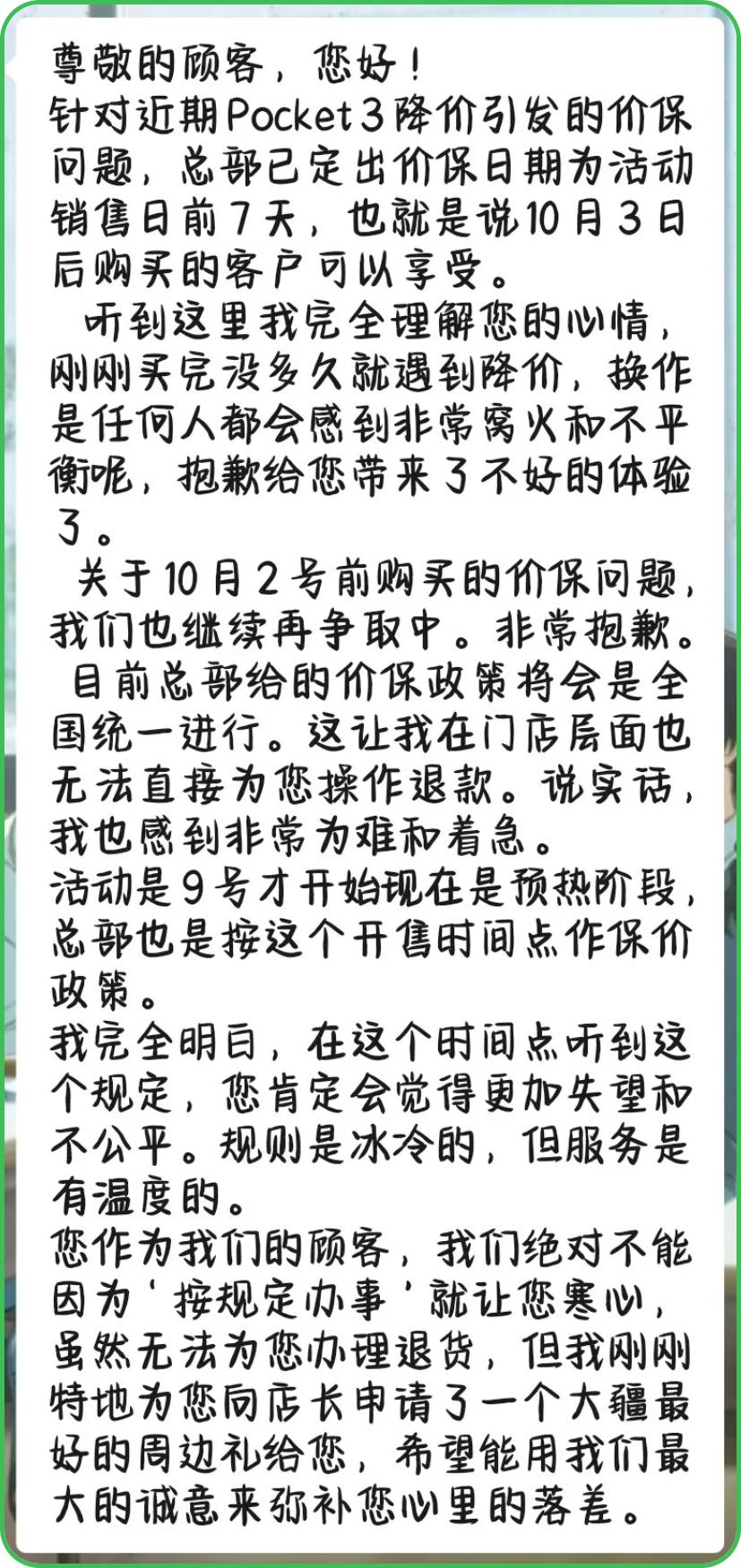 国庆假期的旅行照片还没晒完,为了出片特地买了大疆云台相机用户,就破防了。 10月9日开始的降价,恰好完美错开了绝大多数用户的"7天价保期"。无数为了国庆出行而在9月底下单的消费者,发现自己与数百乃至上千元的差价,只 隔着一个无法逾越的假期。 大疆官方给出的"双十一促销"解释,其实颇为合理,因为当下确实正是部分电商平台进入"双十一"的节点。而节后促销也很容易激起消费者的新鲜感。 10月9日,大疆官方渠道对旗下多款产品进行大幅价格调整。原价3499元的明星产品Osmo Pocket 3,价格直接斩落近20%;Mini系列无人机,最高降幅接 近1500元。 官方将其定义为"双十一常规促销",但因其过于提前的时间点和巨大的降幅,不少新近购买这些产品的消费者被激怒,认为这属于"背刺"。 除了想方设法退款退货之外,社交网络上,"大冤种"的自嘲与愤怒的声讨交织,大疆也顺势被送上热搜。 如果仅看产品本身的功用,这些刚刚完成了首次使命的大疆相机们当然是无可挑剔的。然而,一张降价海报,并不足以说服这些卡点买的用户"早买早享 受"。 某种程度上,反而是他们买得太晚,刚好赶上了这个市场新旧交替的重要拐点——这种时候,品牌最容易有动作 ...