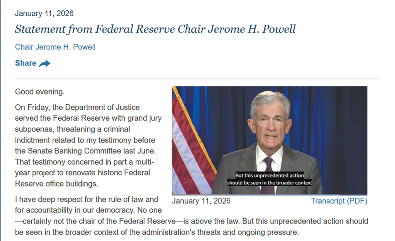 相关消息评论,此举标志美国总统特朗普与美联储的斗争出现前所未有升级。此前,特朗普因美联储未能大幅下 调关键利率而对其一再抨击。有关方面认为,这场斗争再度激化,可能于12日搅动美国金融市场,从长远来看可 能推高抵押贷款和其他贷款的借贷成本。 △美国联邦储备委员会主席鲍威尔(资料图) 美国联邦储备委员会主席鲍威尔11日证实,美国司法部的传票已送至美联储。据悉,联邦检察官已对鲍威尔展开 刑事调查。这一调查与他2025年夏季在国会就美联储办公楼翻新工程所作证词有关。 鲍威尔11日发布视频声明,将上述刑事指控威胁称为旨在破坏美联储独立性的"借口"。 编辑/樊宏伟 特朗普11日坚称他不知道鲍威尔遭调查一事。当被问及这项调查是否旨在施压鲍威尔降息,特朗普回答:"不,我 甚至不会去想这么做。" 据悉,美国联邦住房金融署署长比尔·普尔特是司法部向鲍威尔发传票的主要"推手"。另一名高级别官员则说,此 事与普尔特无关,而是由司法部主导。部分知情人士称,哥伦比亚特区联邦检察官珍尼娜·皮罗签字批准调查鲍威 尔。 美元指数12日一度下跌至98.82,跌幅超0.3%。美元2025年已创下2017年以来最深年度跌幅。美国股指期货当天同 样下 ...