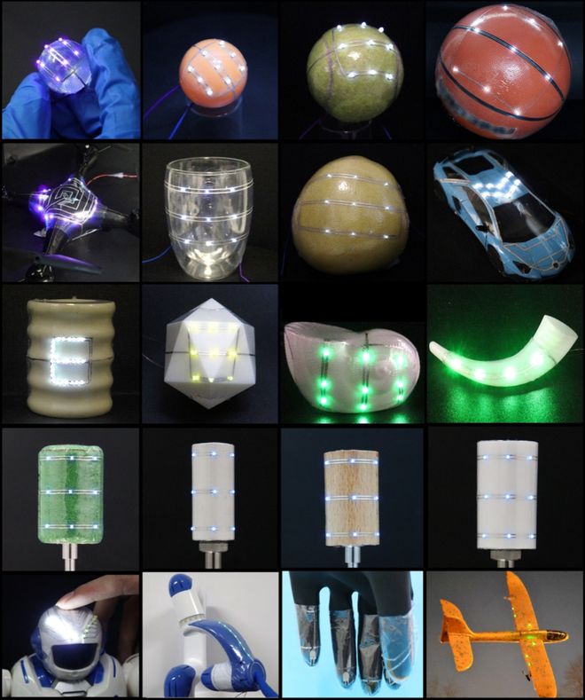 柔性电路在各种材质的异形表面实现共形集成。(受访者供图) 复杂精密的电子电路化身"热缩保鲜膜",热风一吹,便严丝合缝地贴附在任意形状的物体表面——这一 充满想象力的技术场景正在走向现实。 近日,天津大学精密测试技术及仪器全国重点实验室黄显、国瑞团队与清华大学深圳国际研究生院汪鸿 章团队合作,提出一种基于液态金属电路与热塑性薄膜的"热缩制备策略",为柔性电子与智能感知领域 带来重要突破。相关研究成果于1月12日发表在国际权威期刊《自然·电子学》上。 在人工关节、智能头盔、汽车弧形触控面板等不规则3D曲面载体上,制造高性能电路并不是一件容易 事,存在着共形贴合难、精度难控、材料适配差、可靠性不足等一系列问题,还可能出现电路易断裂、 信号不稳、良率偏低等问题。 面对这一柔性电子领域的难题,研究团队创新性地采用常见的热塑性薄膜为基底,此材料遇热收缩,可 紧密包裹物体。为解决普通金属在收缩中易断裂的问题,团队又研制出具有高导电性和良好流动性的半 液态金属材料,通过自主打印技术在平面薄膜上"绘制"出电路。 通过该技术,平面电路在约70摄氏度的温水或热风处理后,无论是圆润的苹果、飞机的机翼,还是灵活 的手指,都能按照预先设 ...
