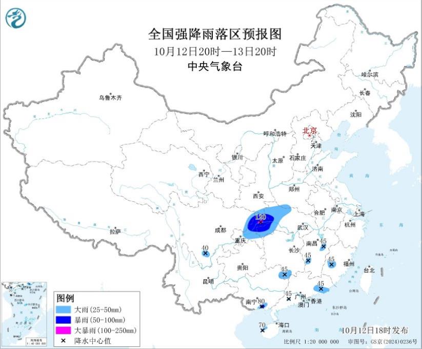 央视网消息:中央气象台10月12日18时继续发布暴雨蓝色预警,预计,10月12日20时至13日20时,陕西东南 部、四川东北部、重庆中北部、湖北西部、河南西南部等地的部分地区有大到暴雨,其中,重庆北部等地局地大暴 雨(100~120毫米)。另外,广东东部和西南部、广西南部、海南岛西部、湖南南部、江西南部和东部、福建西部 等地局地有大雨或暴雨(50~80毫米),上述部分地区伴有短时强降水(最大小时降雨量20~40毫米,局地可超过 50毫米),局地有雷暴大风等强对流天气。 ...