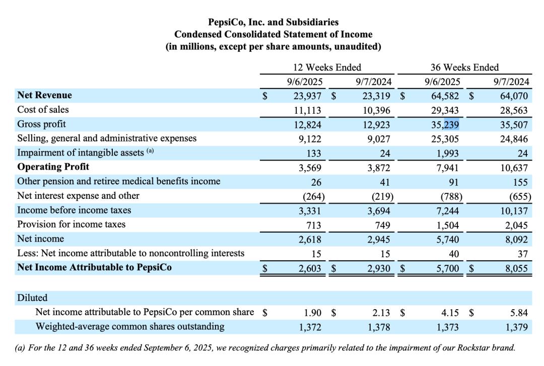 昨日,百事公司发布2025年第三季度财报。报告期内,营收同比增长2.6%至239.4亿美元(折合人民币约1746.42亿元),超出华尔街预期。其中,公司北 美零食和饮料销量下滑,拉美和亚洲市场销量上升。唯独中国市场既没有被单独点名表扬,也没有详细数据披露,只在"包括中国"等字眼中一笔带过。 百事公司第三季度业绩再度超出预期,全球市场表现强劲,尤其是在"国际市场的韧性"方面尤为突出。然而,在百事的全球成绩单中,中国市场的表现却 耐人寻味。 存在感稀薄的尴尬 | | | | 12 Weeks Ended | | | | 36 Weeks Ended | | | --- | --- | --- | --- | --- | --- | --- | --- | --- | | | 9/6/2025 | | | 9/7/2024 | | 9/6/2025 | | 9/7/2024 | | Net Revenue | S | 23,937 | ਫੇ | 23,319 | દ | 64.582 | 8 | 64,070 | | Cost of sales | | 11.113 | | 10,396 | | 29.343 | ...