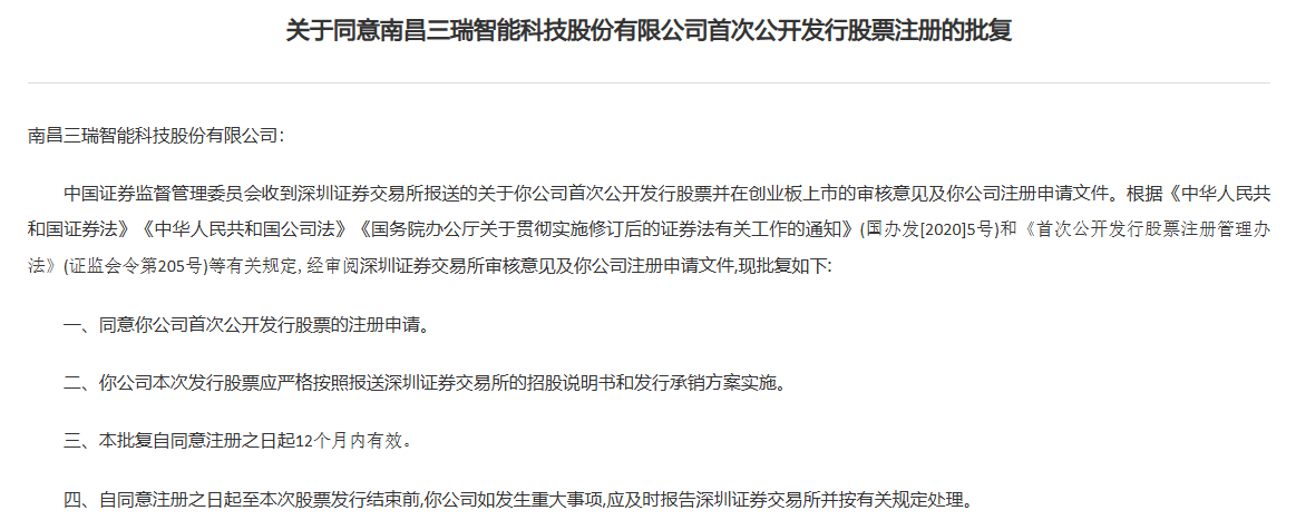 证监会同意三瑞智能创业板IPO注册