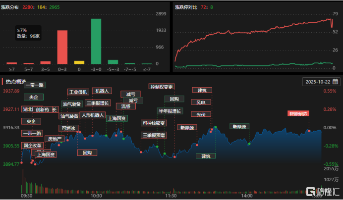 沪深两市成交额1.67万亿,量能进一步萎缩,较上一个交易日缩量2060亿。 沪深两市成交额1.67万亿,量能进一步萎缩,较上一个交易日缩量2060亿。全市场超2900只个股下跌。 10月22日,A股三大股指集体收跌,沪指跌0.07%,深成指跌0.62%,创业板指跌0.79%。 | 代码 | 名称 | 两日图 | 现价 | 涨跌 | 涨跌幅 | | --- | --- | --- | --- | --- | --- | | 000001 | 上证指数 | STAN | 3913.76 | -2.57 | -0.07% | | 399001 | 深证成指 | Shom | 12996.61 | -80.71 | -0.62% | | 399006 | 创业板指 | Norm | 3059.32 | -24.40 | -0.79% | 盘面上,深地经济概念持续升温,地产、银行、大基建板块表现不俗,农业银行14连阳后再创历史新高;锂电池产业链普跌,黄金、稀 土等小金属方向集体下挫,海南、存储芯片概念回调。 具体来看,深地经济概念持续活跃,神开股份、中信重工均3连板。 地产股继续反弹,天保基建、京投发展、盈新发展、光明 ...