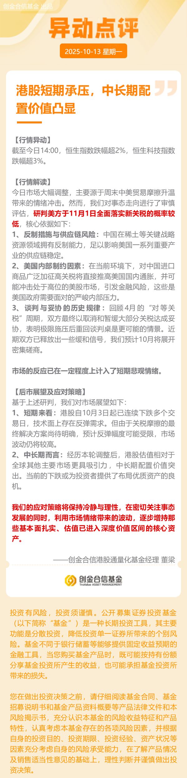 来源:市场资讯 (来源:创金合信基金) 短期波动中孕育机会,港股估值已具吸引力,中长期配置价值凸显。建议保持理性,关注优质资产布局 时机。 美国政府需要面对的严峻内部压力。 3、谈判与妥协的历史规律:回顾4月的"对等关 税"周期,双方最终以取消和暂缓大部分关税达成妥 协,表明极限施压后重回谈判桌是更可能的情景。近 期双方已释放出一些缓和信号,我们预计10月将展开 密集磋商。 市场的反应已在一定程度上计入了短期悲观情绪。 【后市展望及应对策略】 基于上述研判,我们对市场展望如下: 1、短期来看:港股自10月3日起已连续下跌多个交 易日,技术面上存在反弹需求。但由于关税摩擦的最 终解决方案尚待明确,预计反弹幅度可能受限,市场 波动仍将较高。 2、中长期而言:经历本轮调整后,港股估值相对于 全球其他主要市场更具吸引力,中长期配置价值突 出。当前的下跌或为投资者提供了布局优质资产的良 机。 我们的应对策略将保持冷静与理性,在密切关注事态 发展的同时,利用市场情绪带来的波动,逐步增持那 些基本面扎实、估值已进入深度价值区间的核心资 产。 创金合信港股通量化基金经理 董梁 投资有风险,投资须谨慎。公开募集证券投资基金 ( ...