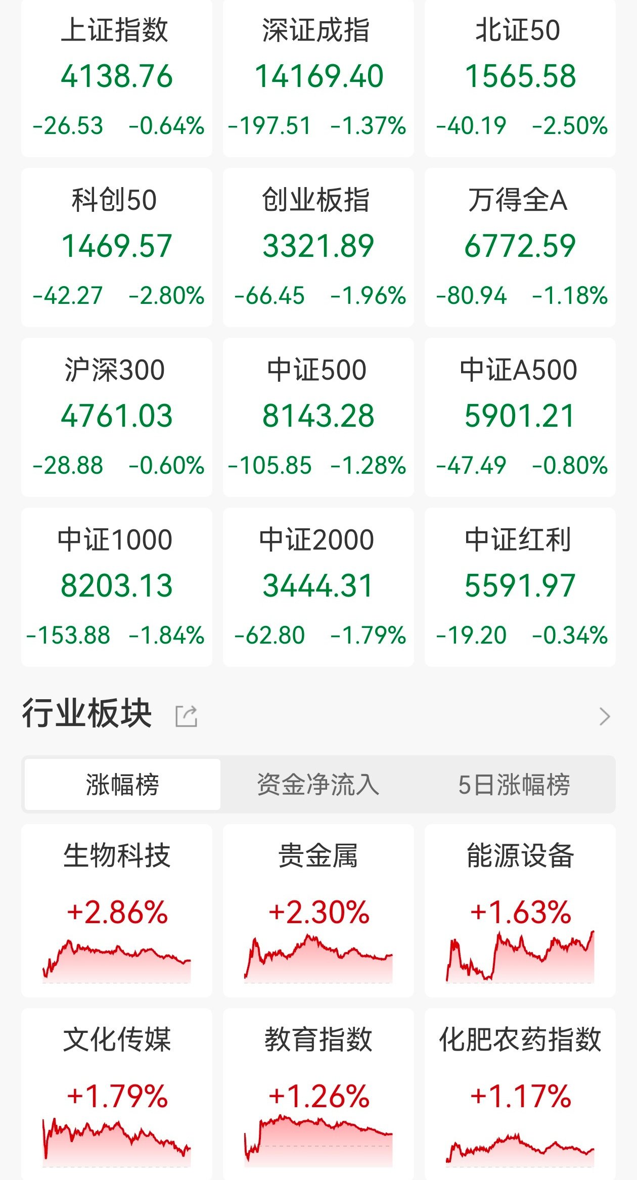 盘面上,马斯克计划2026年大规模量产脑机接口设备,脑机接口板块掀涨停潮,道氏技术、三博脑科及乐普医疗等20股涨停;保险股大涨,新华保险涨超 8%;医疗器械板块走高,赛诺医疗等多股涨停;AI芯片、存储芯片板块拉升,普冉股份、恒烁股份涨停;重组蛋白、快手概念、CRO、游戏及Sora概念等 涨幅居前。另外,海南、免税板块逆市下跌,海汽集团、海南发展领跌;旅游酒店板块走低,凯撒旅业跌近7%;铁路公路、电机及航空机场等板块跌幅居 前。(格隆汇) | 上证指数 | 深证成指 | 北证5( | | --- | --- | --- | | 4023.42 | 13828.63 | 1466.4 | | +54.58 +1.38% +303.61 +2.24% +25.99 +1 | | | | 科创20 | 创业板指 | 万得全/ | | 1403.41 | 3294.55 | 6537.9 | | +59.21 +4.41% +91.38 +2.85% +127.70 +1 | | | | 沪深300 | 中证500 | 中证A5( | | 4717.75 | 7651.20 | 5763.3 | | +87.81 +1 ...