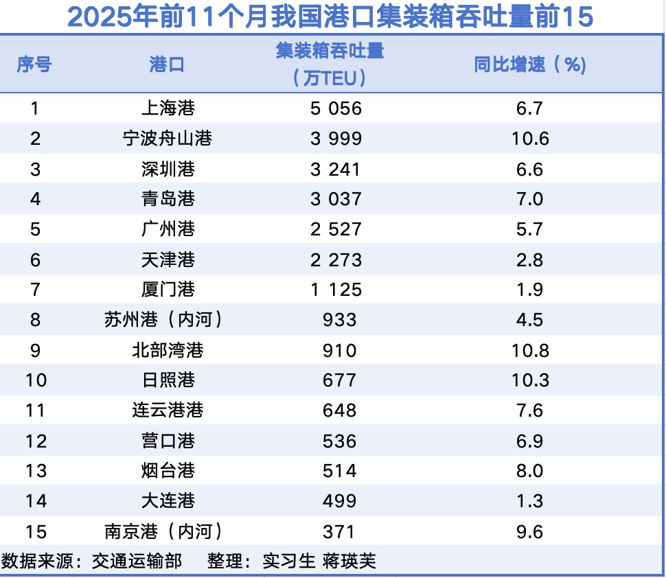 21世纪经济报道记者柳宁馨 实习生蒋瑛芙 杭州报道 过去一年,全球贸易环境不确定性加大,但我国港口吞吐量逆势增长。 2025年前11个月,我国港口完成货物吞吐量167.5亿吨,同比增长4.4%。与此相对应,全球经济波动下,中国贸易依旧保持强劲韧性。 2025年前11个月,我国货物贸易出口24.46万亿元,同比增长6.2%。 从2025年全年来看,主要港口也交出了令人满意的成绩单。2025年,上海港、宁波舟山港等枢纽港稳居全球前列,宁波舟山港成为全球首 个年货物吞吐量超14亿吨的大港,上海港集装箱吞吐量连续第十六年位居全球港口首位。洋浦港、北部湾港等新兴港口增势突出,2025年 洋浦港集装箱吞吐量同比大增65%,北部湾港则迈入千万标箱大港行列。 | | | ( 万TEU) | 同比年旗(%) | | --- | --- | --- | --- | | 1 | 换换上 | 5 056 | 6.7 | | 2 | 宁波舟山港 | 3 999 | 10.6 | | 3 | 深圳港 | 3 241 | 6.6 | | 4 | 英阳临 | 3 037 | 7.0 | | 5 | 广州港 | 2 527 | 5.7 | | ...