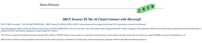 文 | 少年维特 微软这次是真下重注了。 11月3号凌晨,微软和澳洲的算力运营商 IREN(Iris Energy)签了一份为期五年的合作大单,总金额高 达 97 亿美元。公告一出,IREN 股价盘前直接跳涨 20% 以上——要知道这家公司今年已经涨了 480% 了,妥妥的"AI 能源赛道宠儿"。 根据披露,微软会先掏 20% 预付款,剩下分期结算,用于换取 IREN 位于德州 Childress 的数据中心里 的高端 NVIDIA GB300 GPU 算力。IREN 这边要采购 58 亿美元设备,还得负责建 200 兆瓦液冷机房 ——背后电力来自它自家的 2.9 GW 清洁能源电网。 AI基建的"慢变量":微软为什么急着买算力 如果说 OpenAI 让微软站上了 AI 时代的浪尖,那么真正决定它能跑多远的,是那些最不起眼的"慢变 量"——电力、机房、冷却系统,以及审批速度。 这笔交易的核心不是 GPU,因为 AI 扩容的最大瓶颈已经不是模型。在 AI 爆发的这两年,微软最大短 板已经不在模型,而在基础设施。Azure 云服务和 OpenAI 模型都在抢算力,电力批文批不下、机房周 期拉太长,成了微软的掣肘。 ...