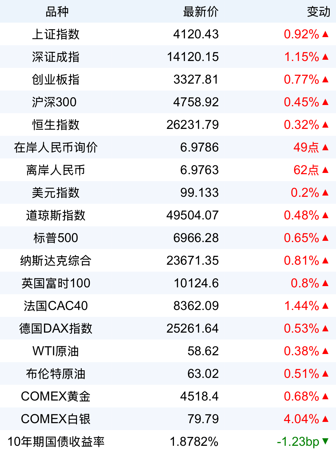 2026年1月10日 星期六 1 美联储发布2025年第三季度资金流动报告, 讨 论美国家庭的财务健康状况 1 李强主持召开国务院常务会议 国务院总理李强1月9日主持召开国务院常务会议,部署实施财政金融协同促内需一揽子政策,研究推行常住地提供基本公共服务有关工作,审议通过《中华 人民共和国自然保护区条例(修订草案)》。(央视网) 2隔夜市场 美股三大指数集体收涨,纳指涨0.81%,标普500指数涨0.65%,道指涨0.48%,其中,道指、标普500指数均创历史收盘新高;英特尔涨超10%,创9月以来 最大单日涨幅,创2024年3月以来新高;特斯拉涨超2%,Meta涨逾1%,苹果、微软、谷歌、亚马逊小幅上涨;奈飞跌超1%,英伟达小幅下跌,苹果结束日 线7连跌。中概股涨跌不一,纳斯达克中国金龙指数跌1.3%,亚朵跌超5%,奇富科技跌逾3%,小鹏汽车、唯品会等跌超2%,贝壳、携程网等跌超1%;霸 王茶姬、传奇生物涨超2%,哔哩哔哩、百度等涨逾1%,金山云、名创优品等小幅上涨。 国际油价集体收涨,美油主力合约涨1.77%,报58.78美元/桶;布伦特原油主力合约涨1.66%,报63.02美元/桶。 国际贵金属普遍收涨, ...