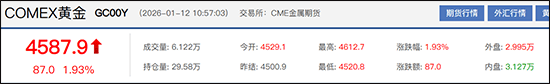 | COMEX黄金 GC00Y (2026-01-12 10:57:03) 交易所: CME全属期货 | | | | | 期货行情 外汇行情 货 | | --- | --- | --- | --- | --- | --- | | 4587.91 | 成交量: 6.122万 | 今开:4529.1 | 量高: 4612.7 | 滋肤幅: 1.93% | 外盘: 2.995万 | | 87.0 1.93% | 持仓量: 29.58万 | 昨德:4500.9 | 最低: 4520.8 | 涨跌额: 87.0 | 内盘: 3.127万 | 美国纽约商品交易所黄金期货价格东方财富网 另据央视新闻报道,2026年第一个完整交易周,在2025年表现强势的贵金属,继续牛市行情,黄金和白 银期货价格均累计上涨,但波动性明显加剧。 当地时间1月11日,美国纽约商品交易所黄金期货价格创历史新高,一度突破每盎司4612.7美元。截至 北京时间12日10时57分,报4587.9美元/盎司,日内涨幅达1.93%。 综合多家金融机构的分析来看,本周有两个因素加剧了贵金属价格的下行压力: 一是彭博大宗商品指数本周启动年度再平衡调整,贵金属权 ...
