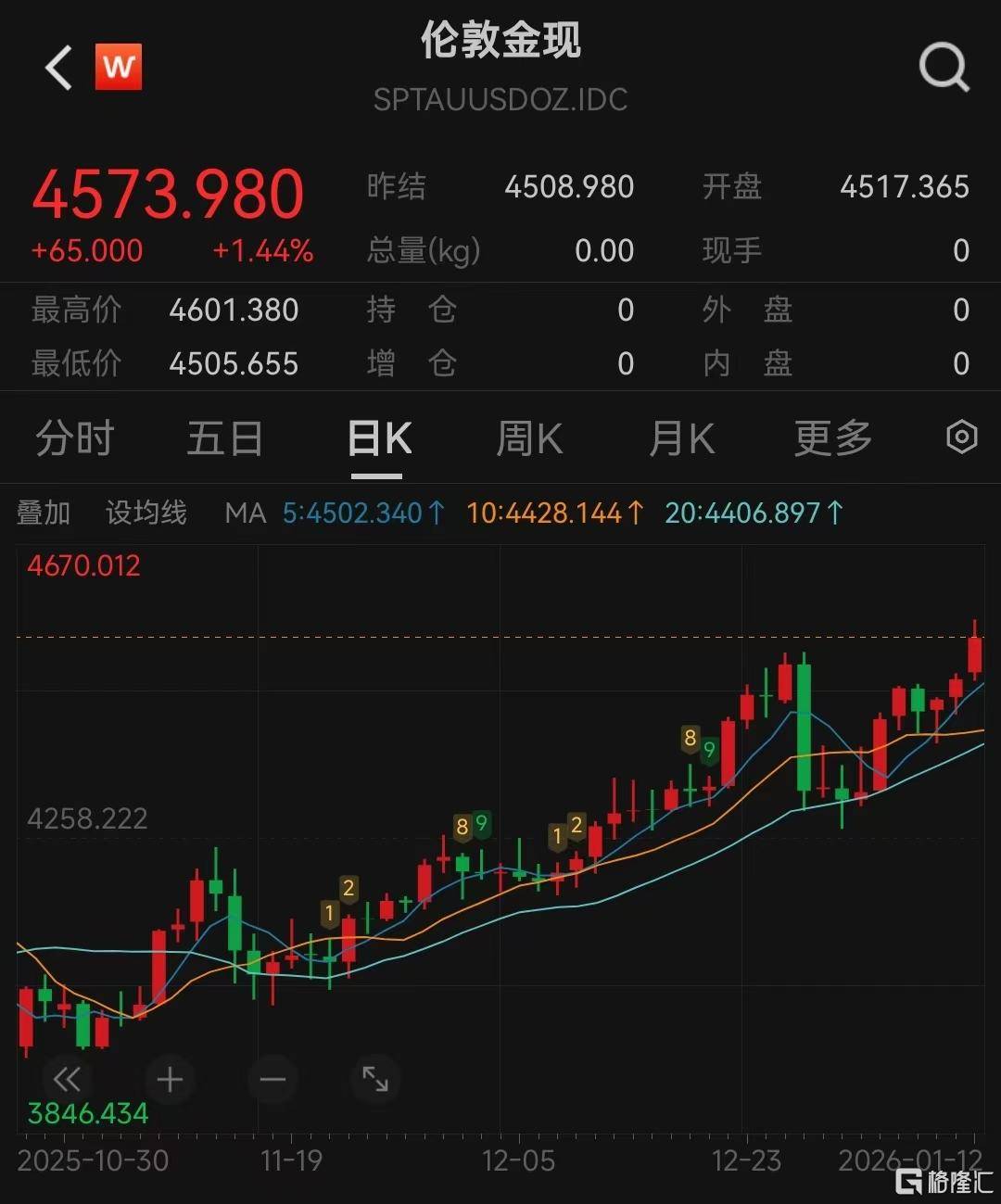 受特朗普与美联储主席鲍威尔矛盾激化,委内瑞拉、伊朗地缘紧张局势等多重因素影响,黄金再创历史新高。 现货黄金今日一度冲上4600美元,最高报4601.38美元,时隔两周再度创下历史新高;COMEX黄金同样突破4600美元大关创历史新高。 地缘政治的不确定性是最直接的催化剂。近期,美军对委内瑞拉发动大规模军事打击,并抓走委内瑞拉总统马杜罗;伊朗国内引发骚乱,美国总统特朗普 公开威胁"随时提供帮助"甚至"严厉打击";特朗普再次公开谈论购买/控制格陵兰岛;此外,俄乌冲突仍然持续。 宏观经济数据方面,上周公布的美国就业报告显示,上月就业增长低于市场预期,强化投资者对美联储将继续降息以支撑经济的押注。在美联储于去年下 半年连续三次降息之后,市场目前已计入今年至少还会有两次降息预期,这对不支付利息的黄金构成利好。 此外,美国司法部威胁要对美联储提起刑事诉讼,引发人们对美联储独立性的担忧。此前,美联储主席鲍威尔表示,对特朗普的潜在起诉"应放在更广泛 的背景下看待,即本届政府威胁并持续施压"以影响美联储的利率决策。去年,特朗普政府对美联储的反复攻击是削弱美元信心的主要因素。 | W | | 伦敦金现 | | | | | | | ...