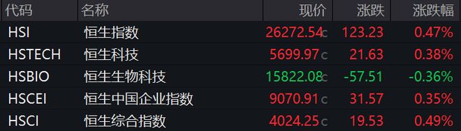 1月9日,香港恒生指数开盘涨0.47%,恒生科技指数涨0.38%。 | 代码 | 名称 | 现价 | 涨跌 | 涨跌幅 | | --- | --- | --- | --- | --- | | əsindən fəsiləsinin cinsinə aid bitki | 恒生指数 | 26272.54c | 123.23 | 0.47% | | HSTECH | 恒生科技 | 5699.97 c | 21.63 | 0.38% | | HSBIO | 恒生生物科技 | 15822.08c | -57.51 | -0.36% | | HSCEI | 恒生中国企业指数 | 9070.91 c | 31.57 | 0.35% | | HSCI | 恒生综合指数 | 4024.25 c | 19.53 | 0.49% | 家电、传媒、国防军工、银行等板块涨幅居前,电气设备、造纸、煤炭、医药生物等板块下跌。 科网股多数上涨,阿里巴巴、京东集团涨逾3%,哔哩哔哩、腾讯音乐、阿里健康涨逾2%;百度集团跌 超2%。 | < w | 恒生科技(HSTECH) | | a | | --- | --- | --- | --- | ...