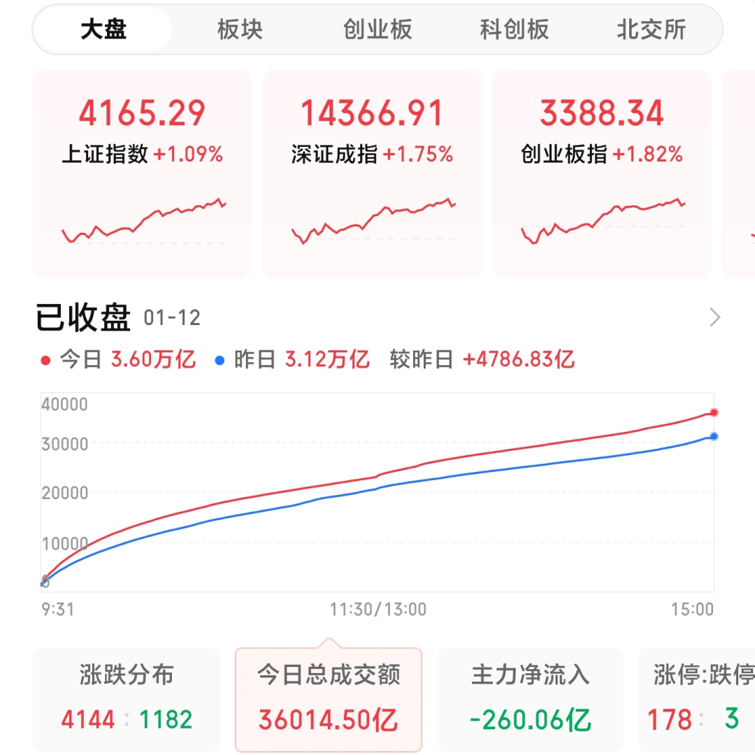 1月12日,A股全市场成交额超3.6万亿元,创下历史新纪录。当日,上证指数收涨1.09%,录得17连阳,再度刷新十年新高。 截至收盘,大盘三大指数集体飘红。上证指数涨1.09%,收于4165.29点;深指涨1.75%,创业板指涨1.82%。此外,科创综指大涨2.88%,北证50涨 5.35%。 沪深京三市成交额达36014亿元,较上一交易日大幅放量4786亿元。这一天量成交创下A股历史新高。A股市场成交额历史峰值出现在2024年10月8日,当 天A股市场成交额达到约3.49万亿元。 上周五,1月9日,A股成交额达31523亿元,历史上第六次突破3万亿元大关。此前2024年10月8日、2025年8月25日、2025年8月27日、2025年8月28日、 2025年9月18日,A股成交额均超3万亿元。 来源:北京日报客户端,记者:孙杰 盘面上,AI应用题材全线爆发,商业航天、核聚变、零售、半导体概念股活跃。市场超4144只股上涨,涨停个股178只。 ...