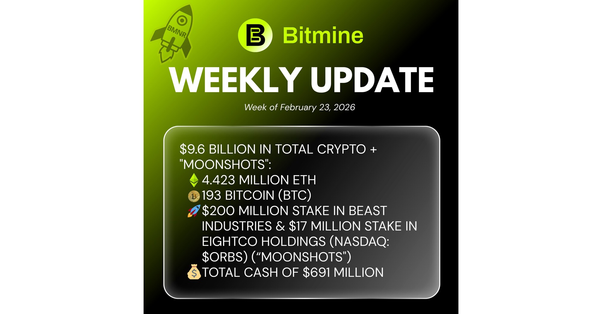 Au 22 février 2026 à 18h00 (heure de l'Est), les avoirs en crypto-monnaies de la Société se composent de 4 422 659 ETH Ã 1 958 $ par ETH (NASDAQ : COIN), 193 Bitcoin (BTC), 200 millions de dollars de participation dans Beast Industries, 17 millions de dollars de participation dans Eightco Holdings (NASDAQ : ORBS) ("moonshots") et une trésorerie totale de 691 millions de dollars. Les avoirs en ETH de Bitmine représentent 3,66 % de l'offre d'ETH (120,7 millions d'ETH). Le message du président est disponible i ...
