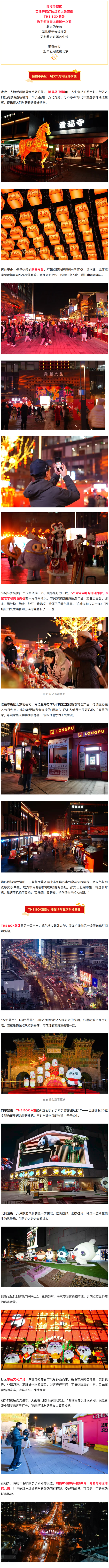 隆福寺街区 百盏祈福灯映红游人的面庞 THE BOX朝外 数字熊猫攀上建筑外立面 北京的年味 既扎根于传统深处 又向着未来蓬勃生长 跟着我们 一起来逛潮流夜北京 米 隆福寺街区:烟火气与潮流感交融 再往里走,便是热闹的新春市集。灯笼点缀的祈福树分列两侧,福字球、绒面福 字装置等景观小品错落有致,暖红光影交织,映照往来人潮,烘托出浓浓年味。 . . . . B . . 夜晚,人流朝着隆福寺街区汇聚。"隆福马"雕塑前,人们争相拍照合影。街区入 口处高悬百盏祈福灯,"跃马扬鞭、万马奔腾、马不停蹄"等马年主题字样璀璨生 辉,寄托着人们对新春的美好期盼。 "这小马好萌啊。"'这是珐琅工艺,卖得最好的一款。"21家老字号与非遗摊位、8 家老字号美食摊位前一片热闹红火,市民游客或俯身挑选年货,或驻足品尝。卤 煮、爆肚粉、烧麦、炒肝、烤地瓜、炒栗子的香气扑鼻,"这味道和过去一样!"西 城区刘先生端着刚出锅的灌肠咬了一口说。 降福寺街区北京稻香村、同仁堂等老字号门店推出的新春特色产品,传统匠心融 入节日创意,成为备受消费者追捧的"爆款",很多人都是一买好几份。"春节回 家,带给家里人尝尝北京特色。"前来"扫货"的王先生说。 左 ...