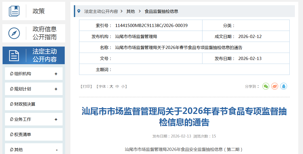 广东省汕尾市市场监督管理局关于2026年春节食品专项监督抽检信息的通告
