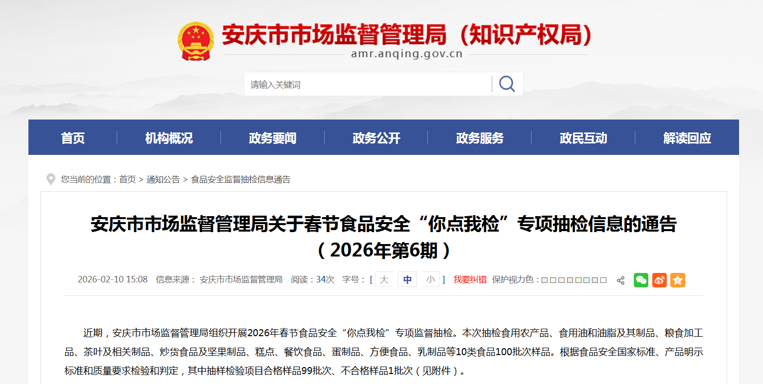 安徽省安庆市市场监督管理局关于春节食品安全“你点我检”专项抽检信息的通告(2026年第6期)