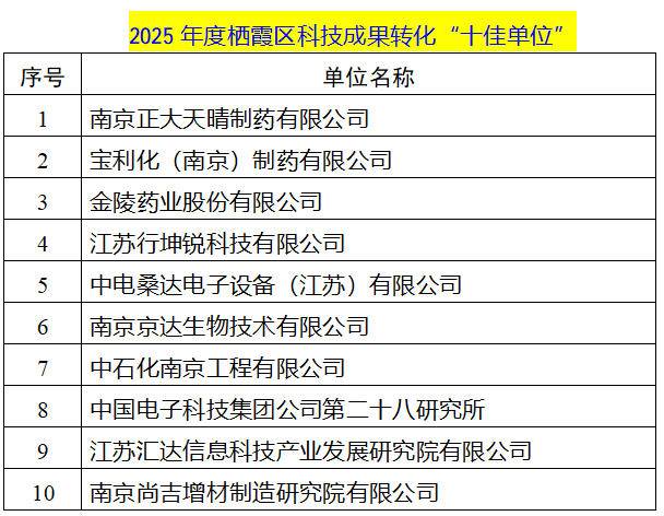 站在仙林大学城迈向国际一流科学城的新起点,栖霞区将持续深化"政策赋能、平台搭桥、龙头引领"三 位一体技术转移体系,进一步优化政策供给、提升"霞科行"平台服务效能、强化标杆企业带动作用,加 快打通教育、科技、人才与产业深度融合的转化通道,让更多科研成果在栖霞落地生根、开花结果,为 全区乃至全市高质量发展注入源源不断的创新动能。 扬子晚报网2月24日讯(通讯员 栖宣 记者 张可)近日,南京市科学技术局正式下达2025年度市技术转 移奖励资金获奖名单,栖霞区共35家单位上榜,累计获得奖补资金155.75万元,排全市第二。此前获 评"2025年度栖霞区科技成果转化十佳单位"的南京正大天晴制药有限公司、中国电子科技集团公司第二 十八研究所等多家主体同步斩获市级奖励,实现"区级标杆"向"市级先进"的跨越,用实绩诠释了栖霞创 新担当。 技术转移是打通科技成果转化"最后一公里"的关键环节,市技术转移奖励资金的设立与发放,旨在深入 实施创新驱动发展战略,完善技术转移体系建设,激励各类主体积极投身科技成果扩散、流动与应用, 为全市科技创新高质量发展注入动能。 | | 2025 年度栖霞区科技成果转化"十佳单位" | | --- ...