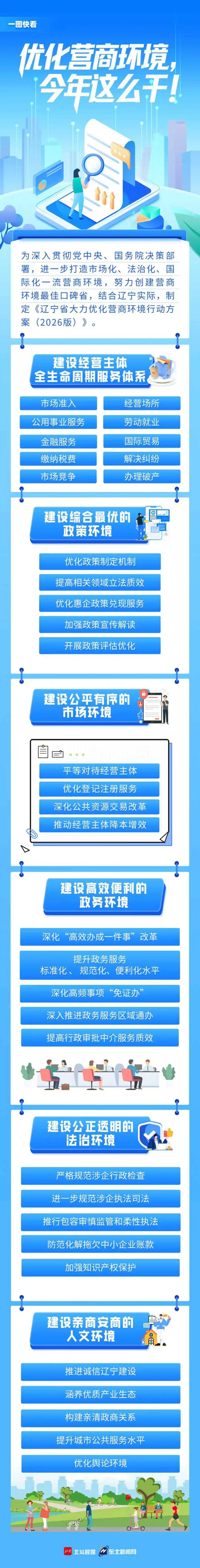 (来源:东北新闻网) 深化"高效办成一件事" 改革 l l l 二 川 当 向 小 坑, 元 小 出 台 向 。 环境最佳口碑省,结合辽宁实际,制 定《辽宁省大力优化营商环境行动方 案(2026版)》。 建设经营主体 全生命周期服务体系 市场准入 经营场所 劳动就业 公用事业服务 国际贸易 金融服务 解决纠纷 缴纳税费 市场竞争 亦理破产 建设综合最优的 政策环境 优化政策制定机制 提高相关领域立法质效 优化惠企政策兑现服务 加强政策宣传解读 开展政策评估优化 建设公平有序的 E 1 4 4 4 平等对待经营主体 优化登记注册服务 深化公共资源交易改革 推动经营主体降本增效 建设高效便利的 取务环境 0 建设公正速明的 法治环境 提升政务服务 标准化、规范化、便利化水平 深化高频事项"免证办" 深入推进政务服务区域通办 提高行政审批中介服务质效 严格规范涉企行政检查 进一步规范涉企执法司法 推行包容审慎监管和柔性执法 防范化解拖欠中小企业账款 加强知识产权保护 建设亲面受商的 人文环境 推进诚信辽宁建设 涵养优质产业生态 构建亲清政商关系 提升城市公共服务水平 总监制/王雪冬 监制/李莹 责任编辑:陈石 审核 ...