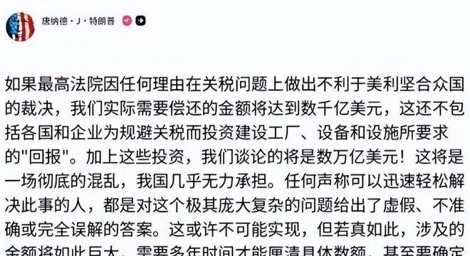 Core Viewpoint - The ongoing debate over tariffs in the U.S. has intensified following President Trump's urgent statement, which warns of dire consequences if the Supreme Court rules against his administration's tariff policies [1][5]. Group 1: Tariff Policy Overview - Since 2025, the Trump administration has utilized the International Emergency Economic Powers Act to impose "minimum baseline tariffs" on major trading partners, including China, bypassing Congress [3][5]. - The legality of these tariffs has been challenged by 12 states and several companies, leading to a ruling by the Federal Circuit Court that deemed the policies unlawful, with the case now escalated to the Supreme Court [5][7]. Group 2: Economic Implications - Trump has indicated that an unfavorable Supreme Court ruling could result in tariff refunds amounting to hundreds of billions of dollars and exacerbate corporate investment pressures, potentially costing the U.S. economy trillions [7][10]. - The U.S. economy remains heavily reliant on global trade, with the trade volume between the U.S. and China reaching $688.3 billion in 2024, highlighting the importance of this relationship for economic growth [9][10]. Group 3: U.S.-China Trade Relations - The deep integration of U.S. and Chinese economies means that any adjustments in trade policies will have widespread implications, affecting employment and investment in the U.S. [17][18]. - Recent discussions between the U.S. and China have led to a gradual reduction in tariff pressures, providing a pathway for improved business conditions and demonstrating the feasibility of cooperative solutions [17][18]. Group 4: Future Considerations - The U.S. government is urged to consider a more pragmatic approach to its tariff policies, balancing domestic and international economic interests to avoid exacerbating financial pressures [10][18]. - The ongoing judicial proceedings and evolving U.S.-China trade relations will continue to shape the future of U.S. trade policy, with significant implications for both domestic and global economic stability [18].