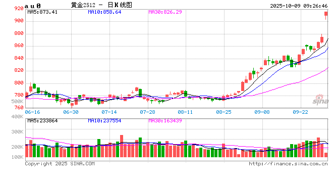 历史新高!沪金期货主力合约大幅跳空高开,突破910元/克关口,国庆期间纽约期金首次触及4000美元