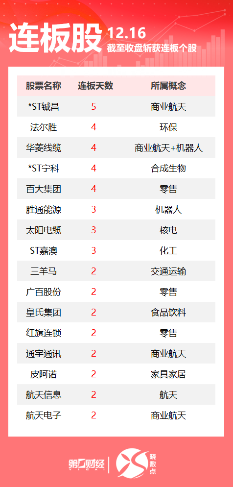 零售股百大集团4连板。一图速览今日连板股>> 第□则经 | 級 12月16日,Wind数据显示,A股市场共计46只个股涨停。其中商业航天板块多股连板,华菱线缆4连 板、通宇通讯2连板;零售股百大集团4连板。一图速览今日连板股>> read in 12 16 截至收盘斩获连振个 | 股票名称 | 连板天数 | 所属概念 | | --- | --- | --- | | *ST城昌 | 5 | 商业航天 | | 法尔胜 | 4 | 环保 | | 华麦线缆 | 4 | 商业航天+机器人 | | *ST宁科 | 4 | 合成生物 | | 百大集团 | 4 | 零售 | | 胜通能源 | 3 | 机器人 | | 太阳电缆 | 3 | 核电 | | ST喜澳 | 3 | 化工 | | 三丰司 | 2 | 交通运输 | | 广百股份 | 2 | 零售 | | 皇氏集团 | 2 | 食品饮料 | | 红旗连锁 | 2 | 零售 | | 通宇通讯 | 2 | 商业航天 | | 皮阿诺 | 2 | 家具家居 | | 航天信息 | 2 | 航天 | | 航天电子 | 2 | 商业航天 | ...