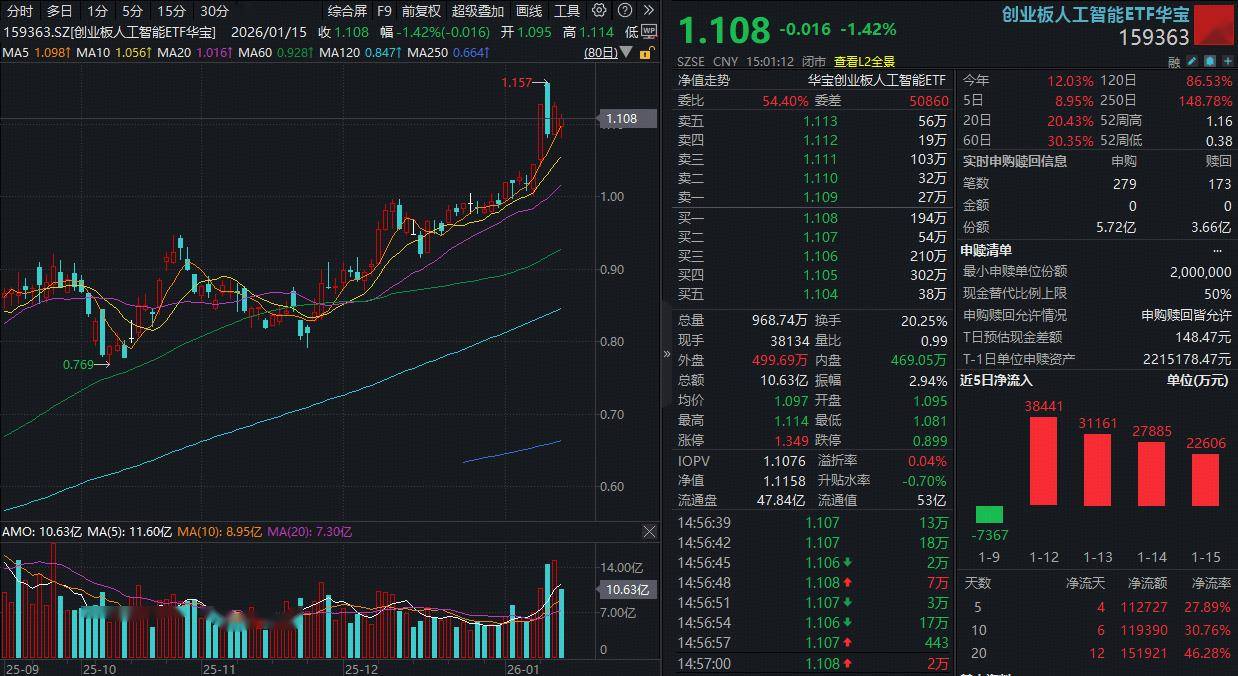 周四(1月15日),创业板人工智能全天下探回升,强势收阳!AI应用题材回落明显,蓝色光标、拓尔思等下挫逾10%,但光模块CPO等算力方向尾盘走 强,"易中天"短线拉升,中际旭创放量涨超5%,新易盛涨超4%,天孚通信涨逾1%,致尚科技、联特科技、兆龙互连等多股涨超6%。 热门ETF方面,双线布局"算力+AI应用"的创业板人工智能ETF(159363)尾盘回暖明显,日线顽强收阳!单日成交超10亿元,资金持续加码,近四日已累 计增持12亿元。 | 分时 多日 1分 5分 15分 30分 蓝龙线 Ed 前复权 超级叠加 画线 工具 2 2 > | | | | | | | | --- | --- | --- | --- | --- | --- | --- | | 159363.SZ(创业板人工智能ETF华宝] 2026/01/15 收1.108 幅 -1.42%(-0.016) 开1.095 高 1.114 低 暖 | | | 108 -0.016 -1.42% | | | | | MA5 1.0981 MA10 1.0561 MA20 1.0161 MA60 0.9281 MA120 0.8471 MA250 0.6 ...