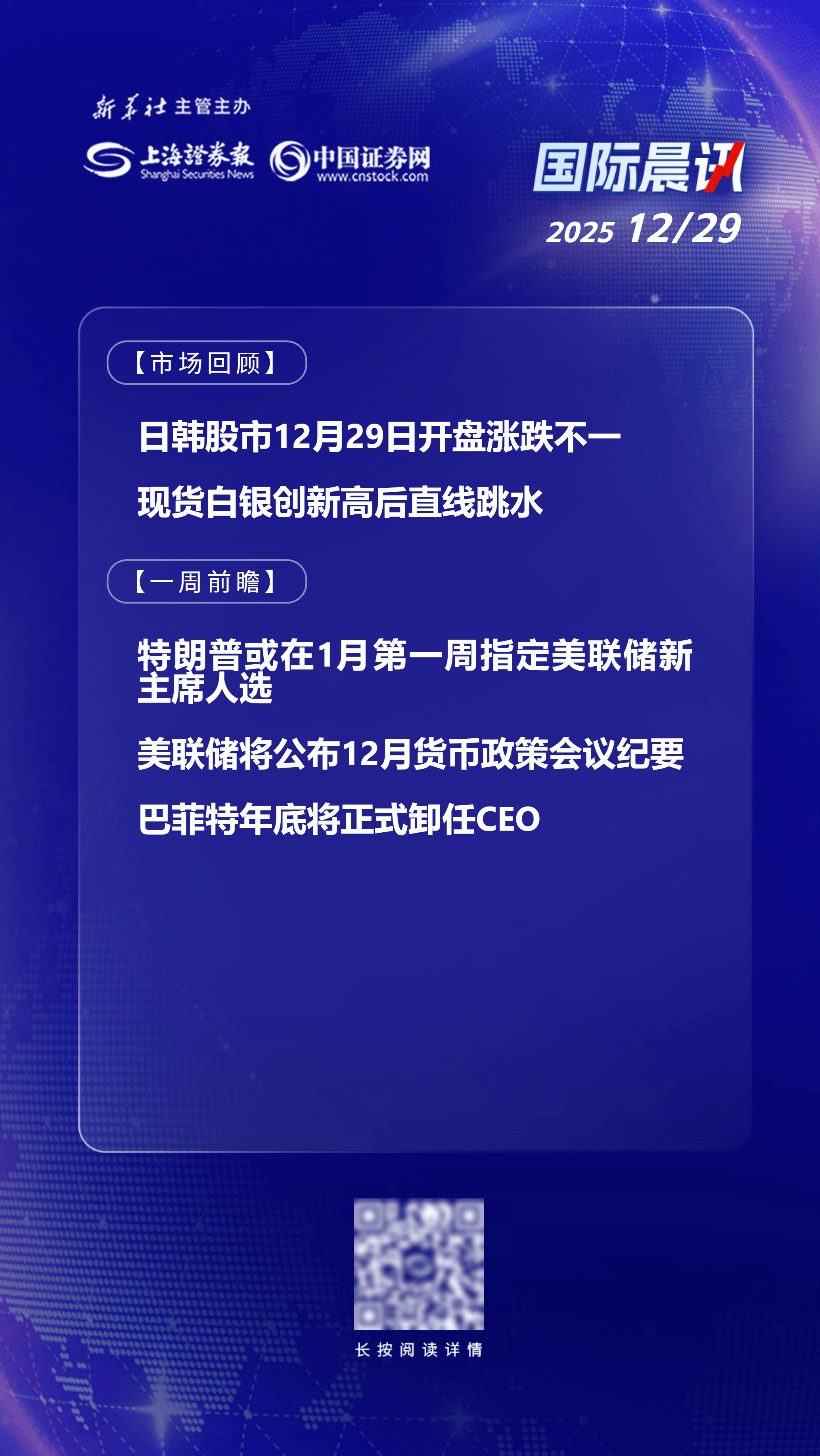 北京时间12月29日,日韩股市开盘涨跌不一;现货白银创新高后直线跳水;据美媒近日报道,美国总统特朗普或将在1月第一周指定美联储新主席人选;本 周,美联储将公布12月货币政策会议纪要;巴菲特将于年底正式卸任伯克希尔·哈撒韦公司首席执行官一职。 【市场回顾】 北京时间12月29日,日韩股市开盘涨跌不一。日经225指数开盘跌0.12%,报50691.22点;韩国综合指数开盘涨0.41%,报4146.48点。 现货白银12月29日开盘快速拉升,盘中迅速升破83美元/盎司关口,继续刷新历史新高。随后,现货白银直线跳水,日内由涨转跌。截至北京时间8时30分, 现货白银报75.543美元/盎司,日内跌幅近5%,此前一度涨近6%;COMEX白银涨超4%,报80.64美元/盎司。其他贵金属方面,现货黄金失守4500美元/盎 司,COMEX黄金小幅下跌。 当地时间12月26日,美股三大股指小幅收跌。截至收盘,道琼斯指数跌0.04%,报48710.97点;标普500指数跌0.03%,报6929.94点;纳斯达克综合指数跌 0.09%,报23593.10点。上周,美股三大指数均累涨超1%,其中道指涨1.2%、标普500指数涨1.4% ...