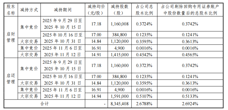 Core Viewpoint - The announcement details the completion of a share reduction plan by specific shareholders of Beishidake, indicating a significant decrease in their holdings and the financial implications of this action [1][3]. Shareholder Reduction Plan - The shareholders, Qicai Management and Qimai Management, held a total of 11,700,000 shares, representing 3.7556% of the company's total share capital [2]. - The reduction plan allowed for a maximum sale of 9,298,731 shares, equating to 2.9848% of the total share capital [2]. - The reduction occurred through both centralized bidding and block trading, with specific limits on the number of shares sold via each method [2]. Implementation Details - From September 29, 2025, to November 12, 2025, a total of 8,345,408 shares were sold, which is 2.6788% of the total share capital [3]. - The average selling prices varied, with Qicai Management selling shares at prices ranging from 14.84 to 17.18 CNY per share [4]. Financial Outcome - The total cash generated from the share reduction amounted to approximately 131 million CNY [4]. Company Background - Beishidake was listed on the Shenzhen Stock Exchange on March 13, 2020, with an initial public offering price of 23.57 CNY per share [5]. - The company raised a total of 629 million CNY from its IPO, with net proceeds of 550 million CNY allocated for various projects including production and R&D [6].