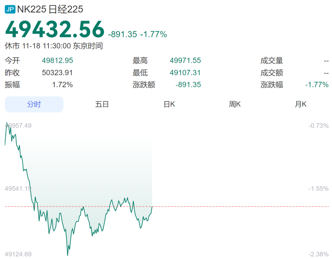 每经编辑|陈柯名 日本股市延续跌势。 日本东证指数快速跳水,跌近1.5%,现报3297.96点。 11月18日,日本股市大幅跳水,日经225指数一度下跌超1000点,跌幅超2%。截止发稿,下跌1.77%。 | 今开 | | 49812.95 | | 最高 | 49971.55 | | 成交量 | | | --- | --- | --- | --- | --- | --- | --- | --- | --- | | 昨收 | | 50323.91 | | 最低 | 49107.31 | | 成交额 | | | 振幅 | | 1.72% | | 涨跌额 | -891.35 | | 涨跌幅 | -1.77% | | | 484 | | FF | | 日K | 봄K | | 日K | 个股方面,受隔夜美股科技股走低影响,软银集团一度跌超5%,东京电子、爱德万测试、任天堂等跟跌。此外,资生堂、味之素、迅销等消费股纷纷走 低。 | 名称 | 现价 | 涨跌幅 = | 总市 -- | | --- | --- | --- | --- | | 古河电气工业 | 9636.0 | -6.72% | 6809亿 | | 5801. ...